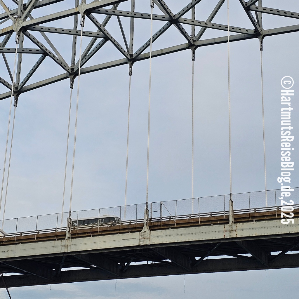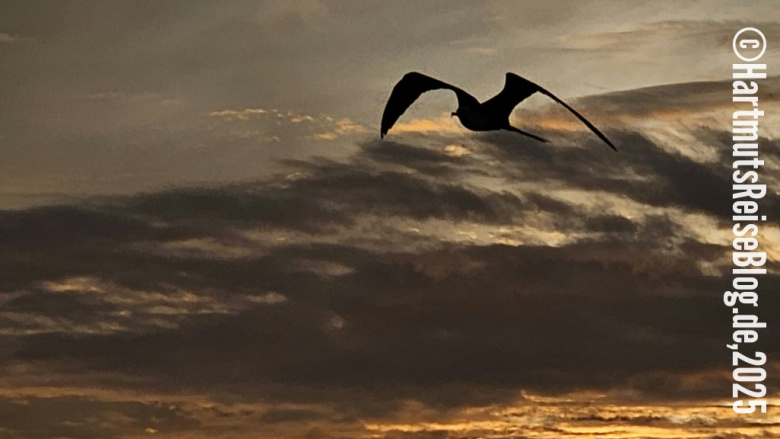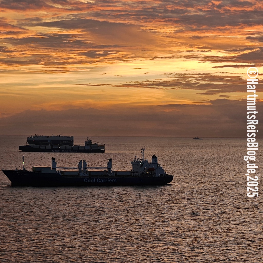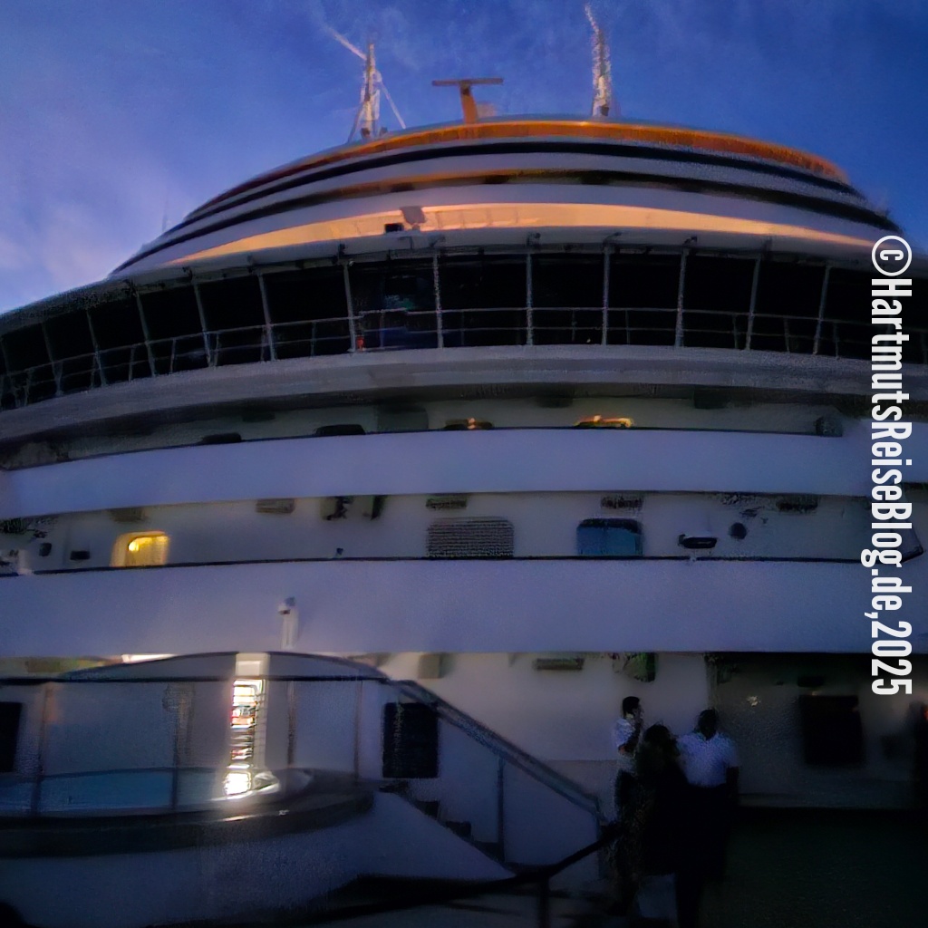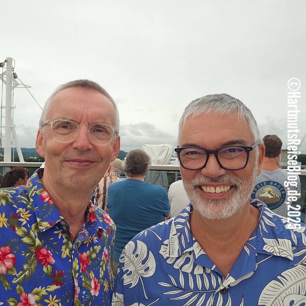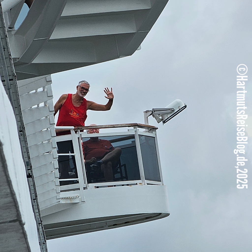 Schon vor fünf Uhr stehen wir auf. Eine halbe Stunde später sind wir auf Deck 5, einem Bereich, der normalerweise für Passagiere nicht zugänglich ist. Am Horizont geht allmählich die Sonne auf. Kaffee und Berliner werden angeboten. Da wir jedoch nicht wirklich alleine sind, gehen wir nach ganz oben auf Deck 14. Hier haben nur größere Personen eine gute Sicht. Kommentare bleiben nicht aus: Amerikaner, oft eher untersetzt, machen häufig nette Bemerkungen über unsere Größe, was zeigt, dass wir auffallen. Wir sind die „exotischen Vögel“, meist auch farbenfroh gekleidet.