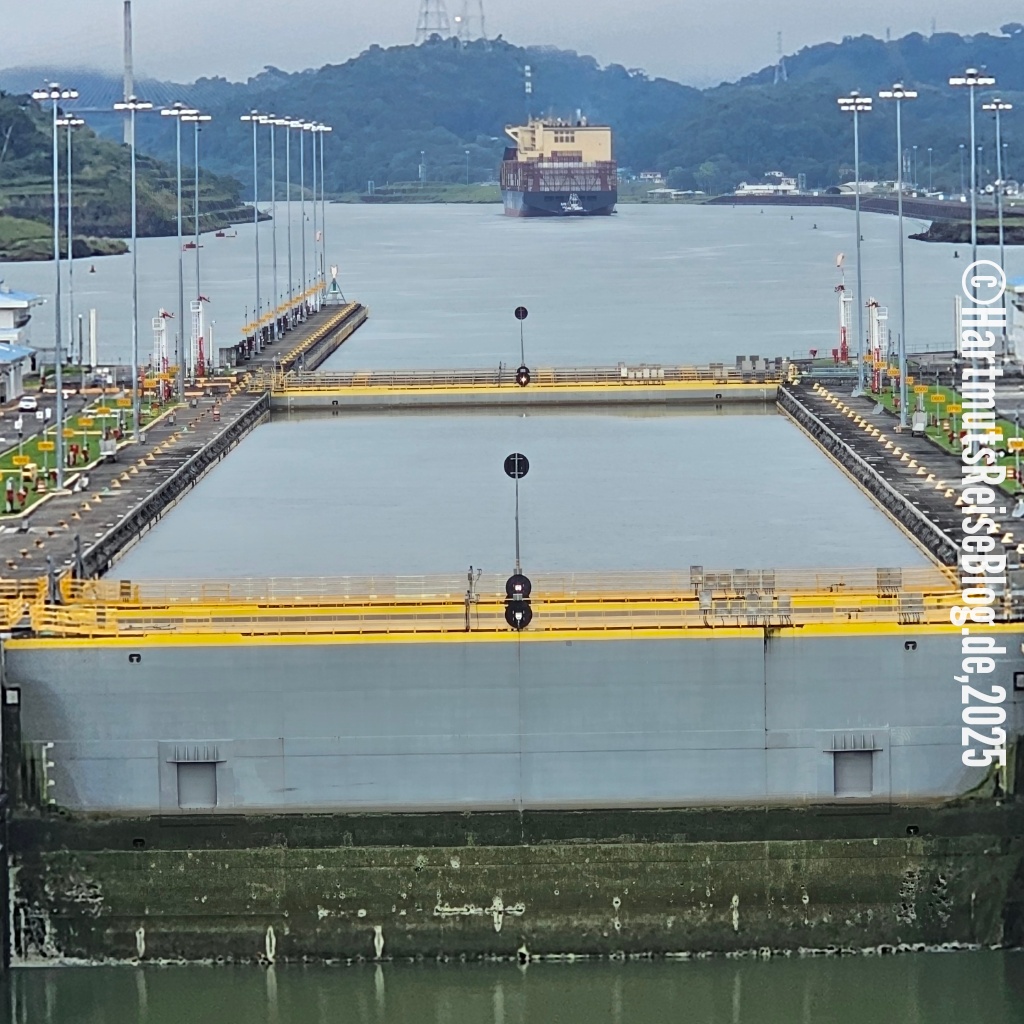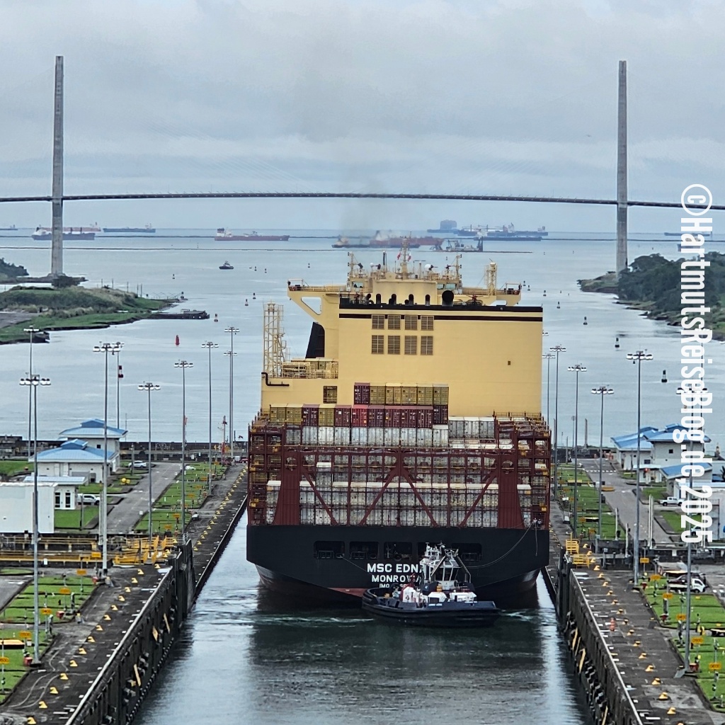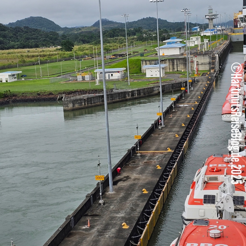 Im Culebra Cut (und anderswo) dienen Schlepper als seitliche Sicherheitshilfe. Sie drücken sofort gegen den Rumpf, um das große Schiff im engen Fahrwasser zentriert zu halten und Kollisionen bei Wind oder Strömung zu verhindern. Auch bei der Ausfahrt zum Atlantik nutzt die MS Koningsdam die neuen und größeren Schleusen. Diese befinden sich nahe Colón und sind der letzte Schleusenkomplex, bevor das Schiff den Atlantischen Ozean erreicht. Vor der Schleusendurchfahrt muss unser Schiff jedoch einige Zeit warten, denn hier im Panamakanal ist offensichtlich viel los.