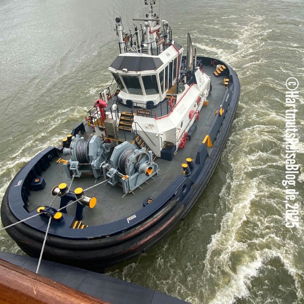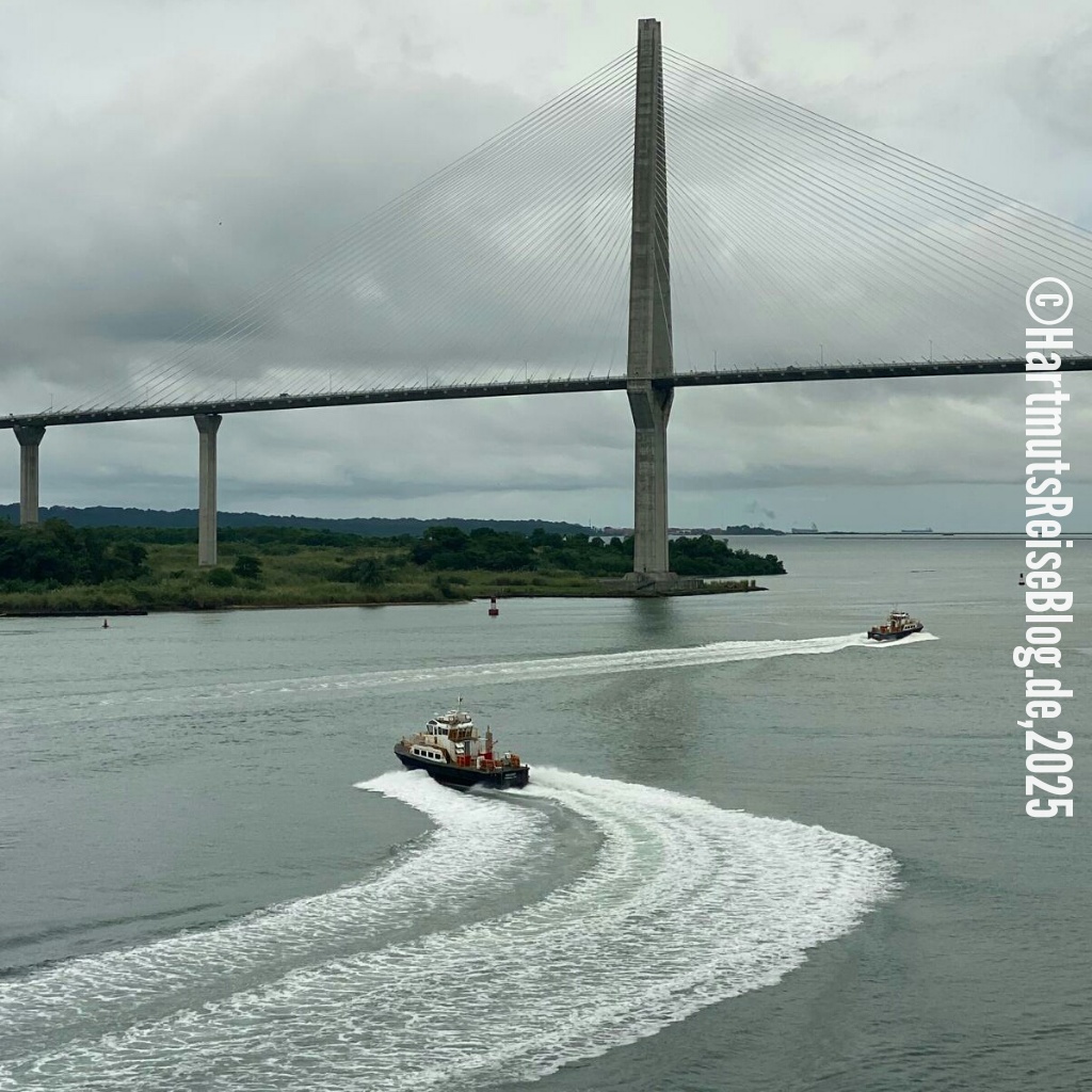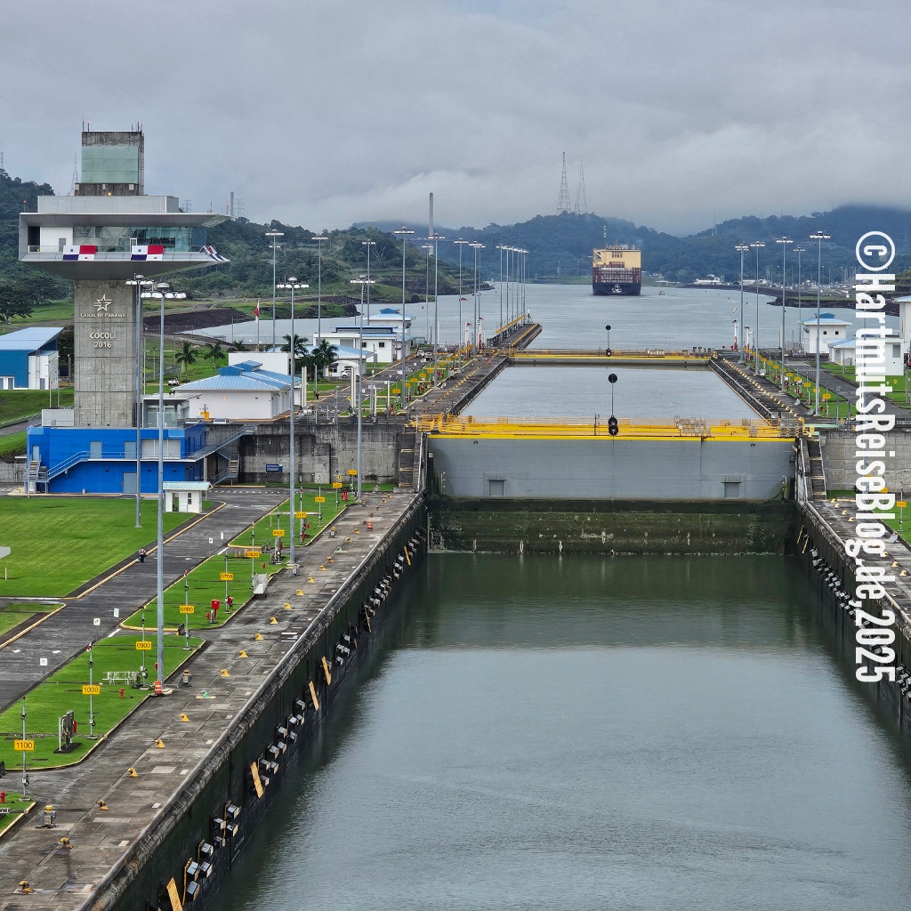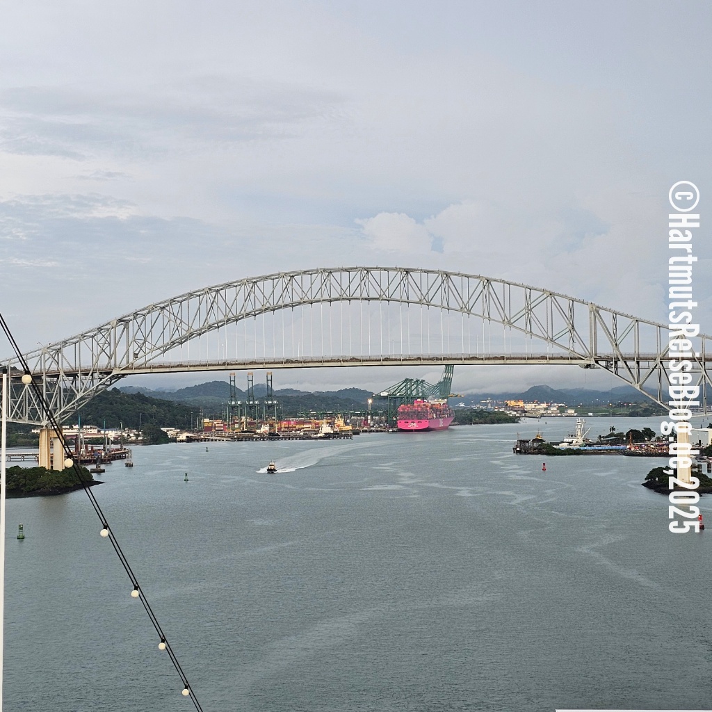 Im Culebra Cut (und anderswo) dienen Schlepper als seitliche Sicherheitshilfe. Sie drücken sofort gegen den Rumpf, um das große Schiff im engen Fahrwasser zentriert zu halten und Kollisionen bei Wind oder Strömung zu verhindern. Auch bei der Ausfahrt zum Atlantik nutzt die MS Koningsdam die neuen und größeren Schleusen. Diese befinden sich nahe Colón und sind der letzte Schleusenkomplex, bevor das Schiff den Atlantischen Ozean erreicht. Vor der Schleusendurchfahrt muss unser Schiff jedoch einige Zeit warten, denn hier im Panamakanal ist offensichtlich viel los.