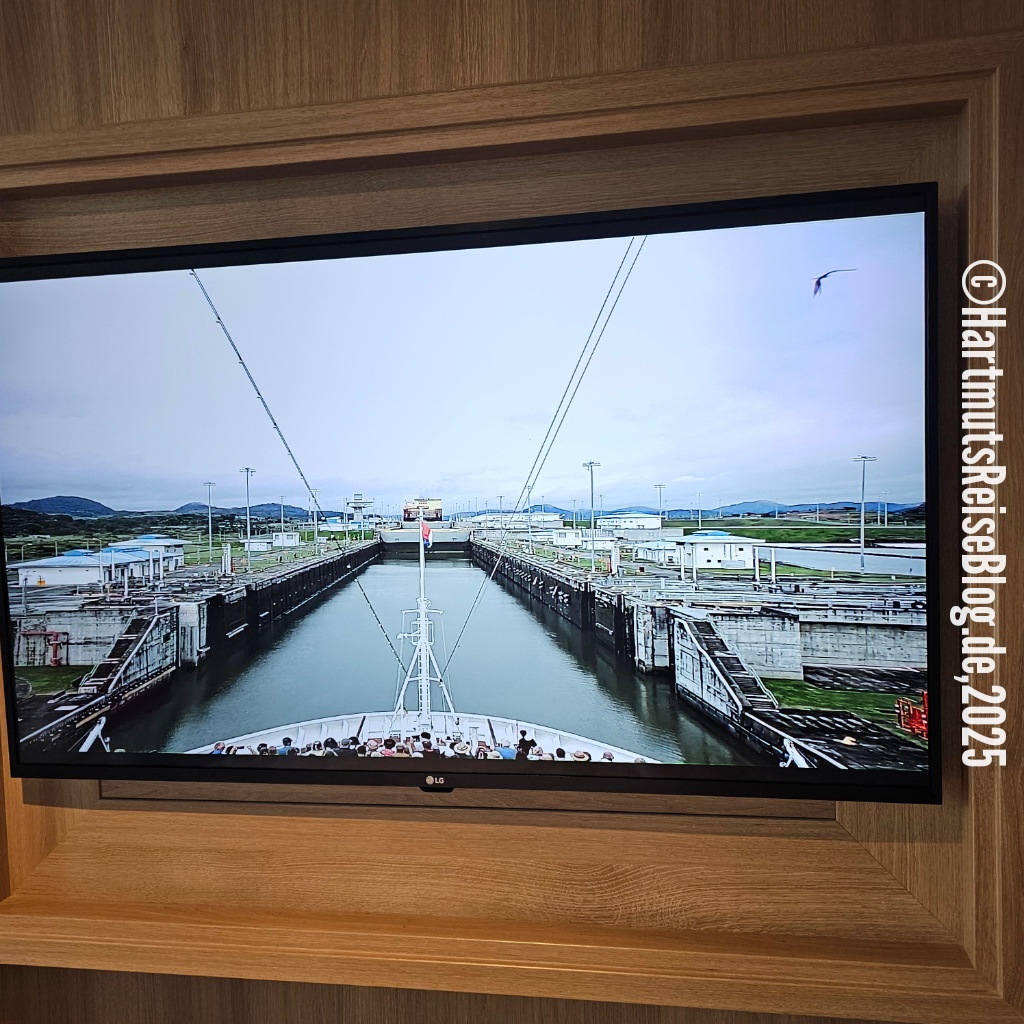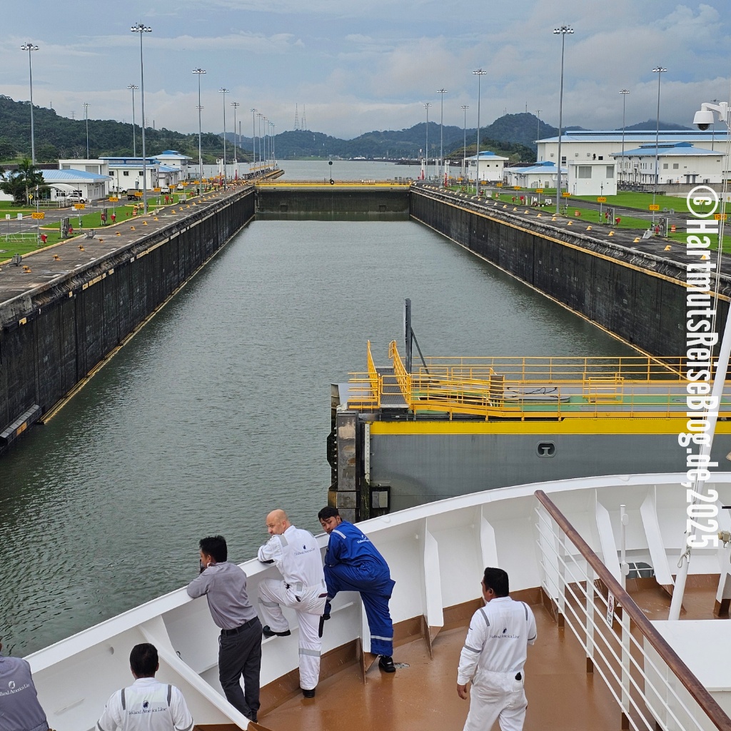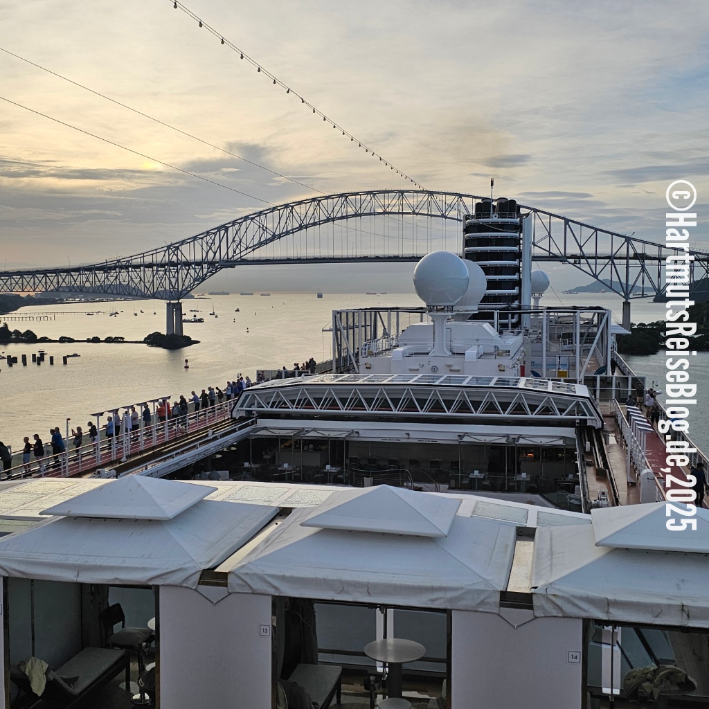 Kurz nach 15 Uhr verlässt das Schiff die letzte Schleuse. Wenig später passieren wir die dritte Brücke über dem Panamakanal – und sind damit im Atlantischen Ozean. Damit hat zum ersten Mal ein Schiff der Holland America Line den Panamakanal vollständig durchquert. Der Kapitän ist hörbar stolz!