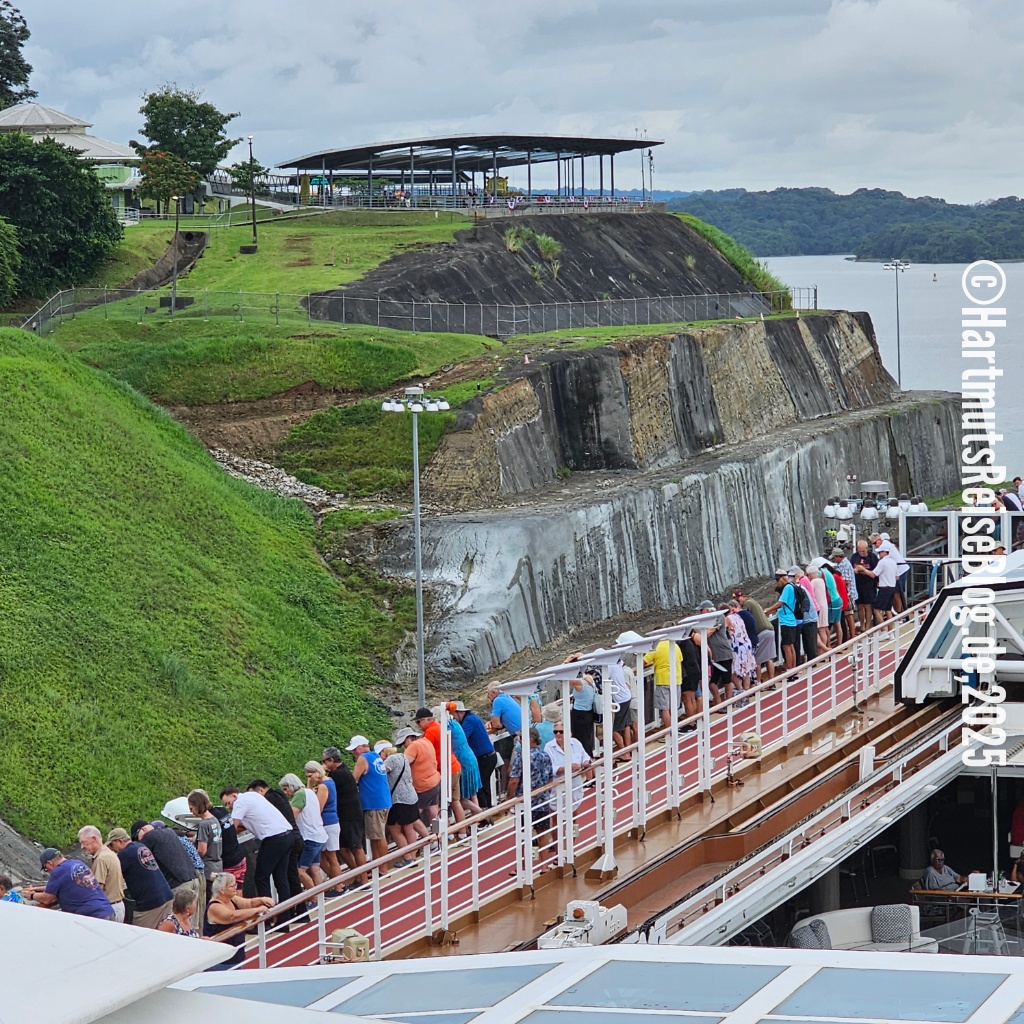 Nachdem die MS Koningsdam die Schleusen an der Pazifikküste passiert hat, geht es weiter zum Lago Gatún, der einzigen Stelle im Panamakanal, wo Gegenverkehr möglich ist. Der Lago Gatún ist ein künstlicher See in Panama, entstand Anfang des 20. Jahrhunderts durch den Bau des Gatún-Staudamms, liegt 26 Meter über dem Meeresspiegel, ist etwa 425 Quadratkilometer groß, versorgt die Schleusen mit Wasser und ist Lebensraum für Krokodile, Affen und Faultiere.