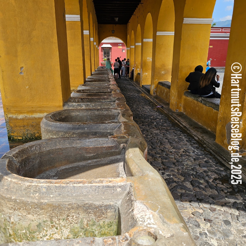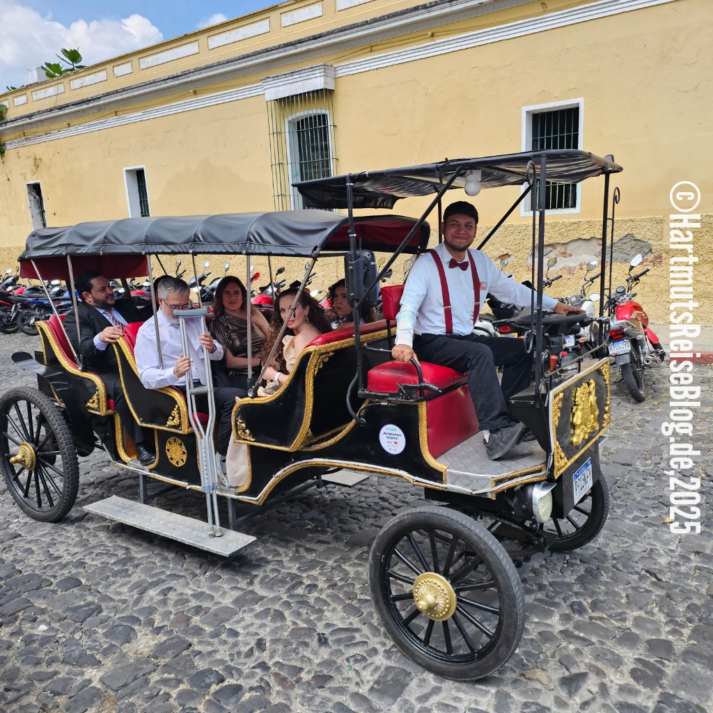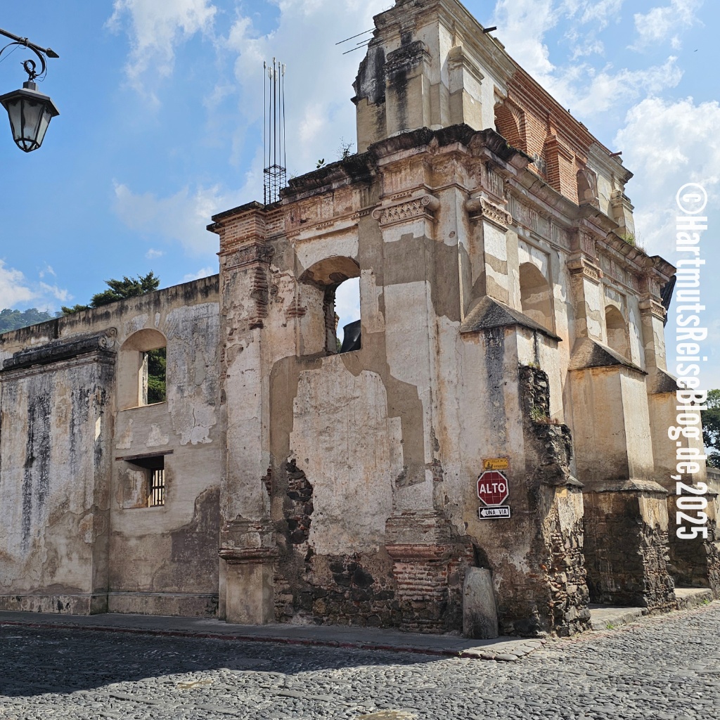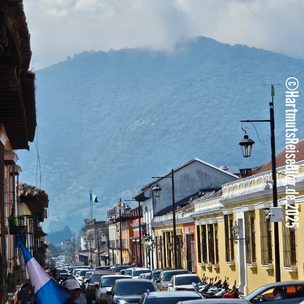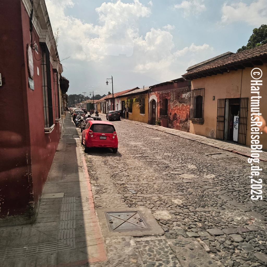 Von Puerto Quetzal bringt uns der Bus in die alte Hauptstadt Antigua Guatemala. Die Straße ist in einem schrecklichen Zustand, wird zurzeit aber instandgesetzt. Ich betrachte die Landschaft mit ihren Bananen- und Zuckerrohrplantagen. (Während Andreas sich über die Zwischenstände der Bundesliga aufregt.) Unterwegs erfahren wir viel über Guatemala und seine alte Hauptstadt. Als wir in Antigua ankommen, ist es bereits nach elf Uhr.