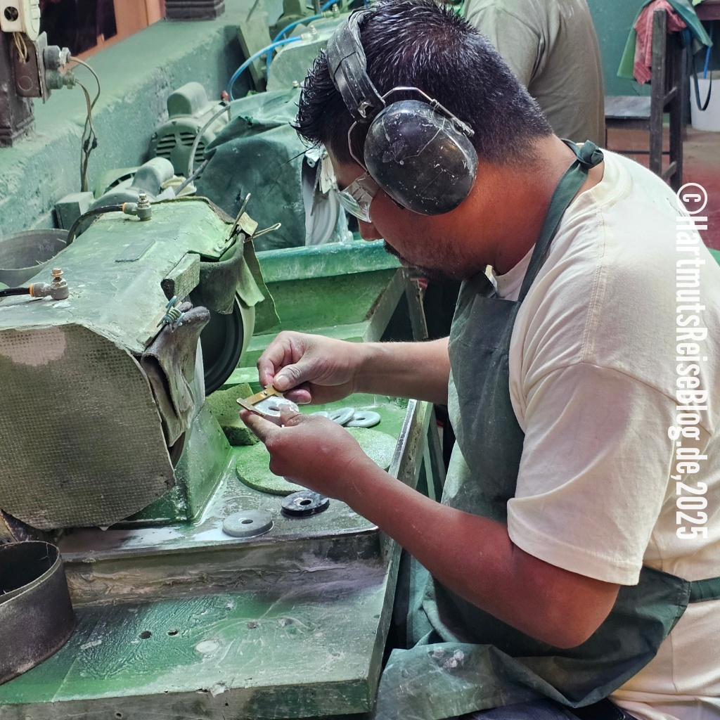 Nach einer ausgiebigen Rumverkostung geht’s in eine Schleifere, in der Jadesteine verarbeitet werden. Ein leckeres Mittagessen mit musikalischer Begleitung rundet den Besuch in Antigua ab.