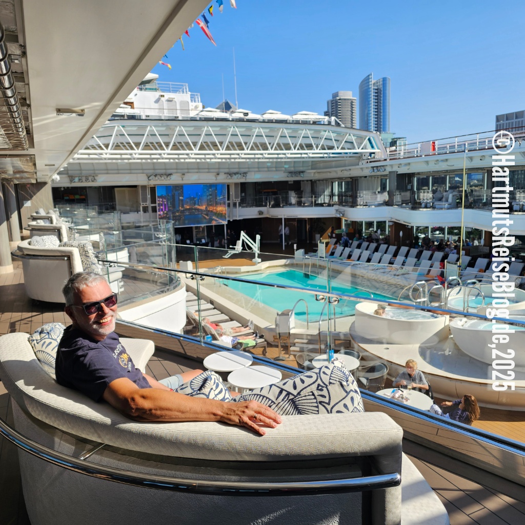 Gegen zehn Uhr verlassen wir unser Hotel. Durch das Menschengetümmel geht’s auf die andere Straßenseite. Direkt neben der MS Koningsdam liegt auch die MS Nieuw Amsterdam vor Anker. Tausende Menschen kommen von den Schiffen und ebenso viele wollen an Bord gehen. Wir geben unsere Koffer ab, gehen durch die Gepäckkontrolle, werden fotografiert und müssen immer wieder unsere Papiere vorzeigen. “Are you brothers?” Auch diese Frage wird uns gestellt. Vermutlich nicht zum letzten Mal. Das gesamte Personal ist total freundlich und hilfsbereit. Kurz vor elf sitzen wir in einem riesigen Wartesaal. In Händen halten wir die “Boarding Card, Group 4”. Nach und nach werden die einzelnen Gruppen aufgerufen. Unsere Kabine befindet sich auf dem siebten Deck. Made und Putu heißen die beiden Stewarts, die für unseren “Stateroom” zuständig sind. Auf dem Lido Deck stoßen wir auf unsere 17tägige Kreuzfahrt nach Fort Lauderdale an.