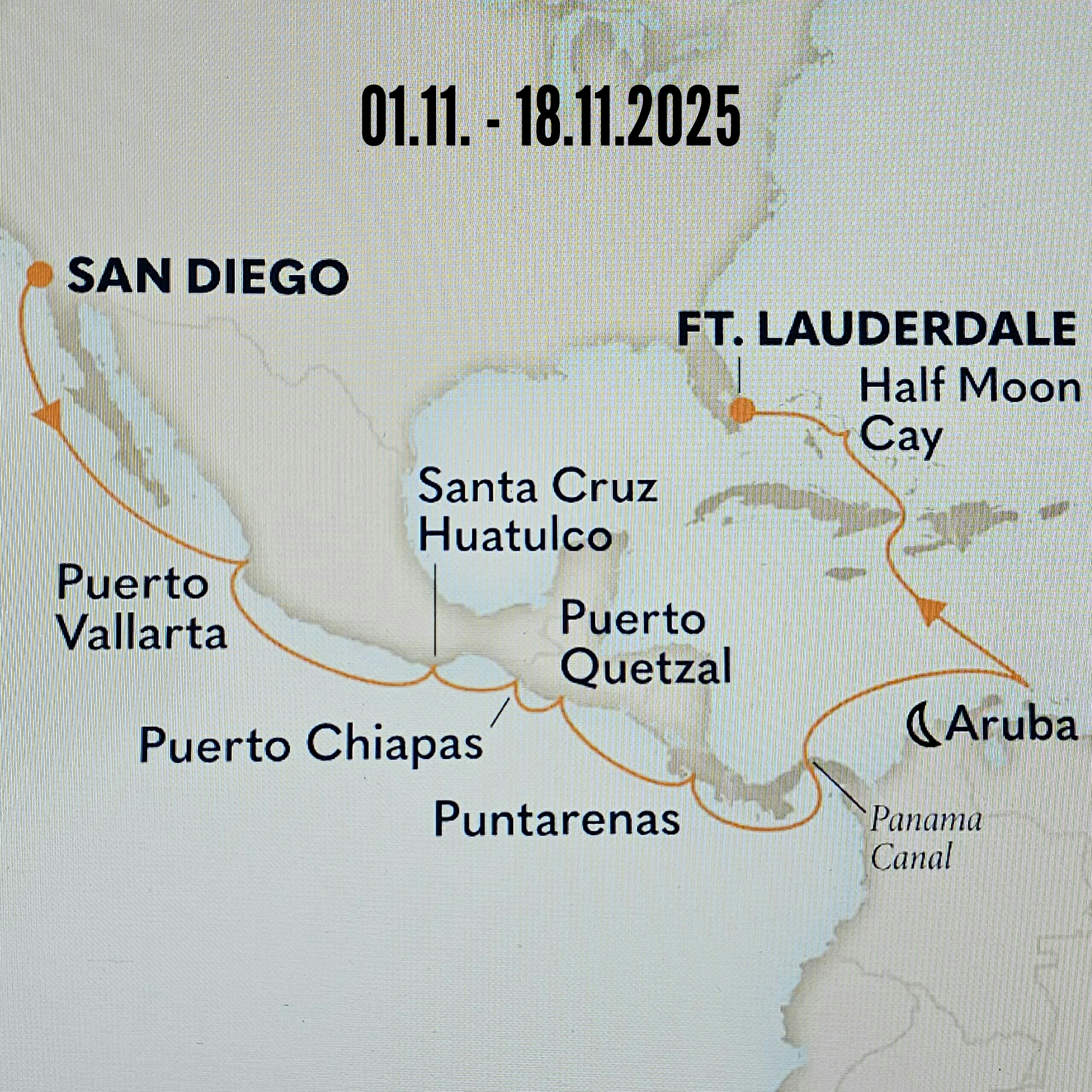 Gegen 20 Uhr verlässt unser Schiff – mit vier Stunden Verspätung – den Hafen von San Diego. Für die 1.900 Kilometer bis Puerto Vallarta in Mexiko benötigt die MS Koningsdam zwei Tage. Die Route führt entlang der Küste von Baja California und durch den Golf von Kalifornien.