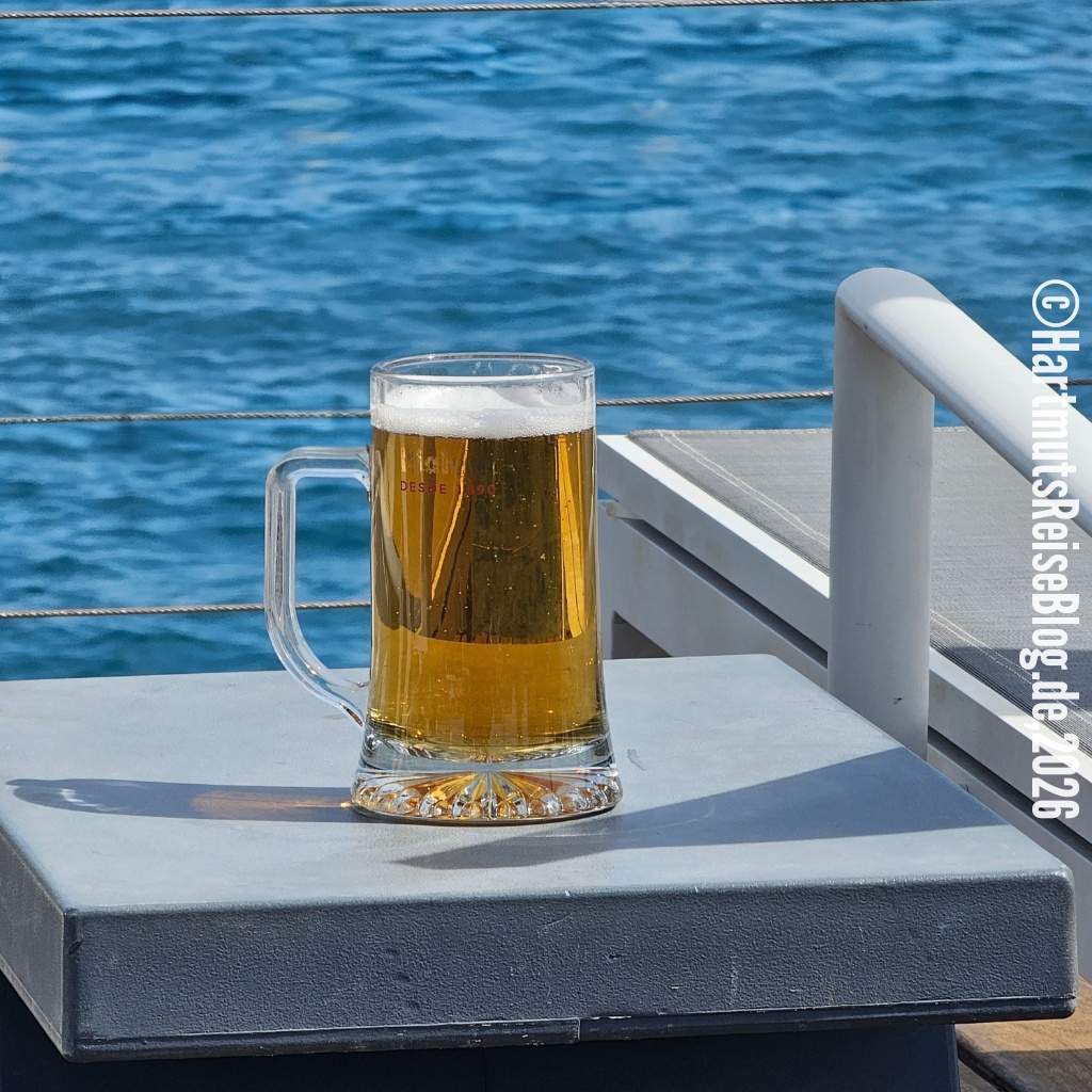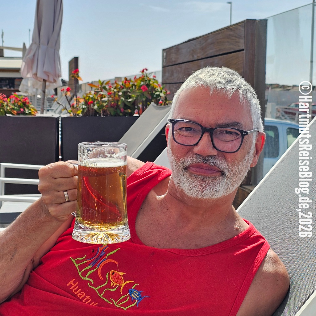 Das Wetter ist sommerlich: wenige Schleierwolken und 26 Grad. Zwei Liegen mit Handtüchern und ein Sonnenschirm kosten 30 Euro. Das Bier ist schön kalt.
