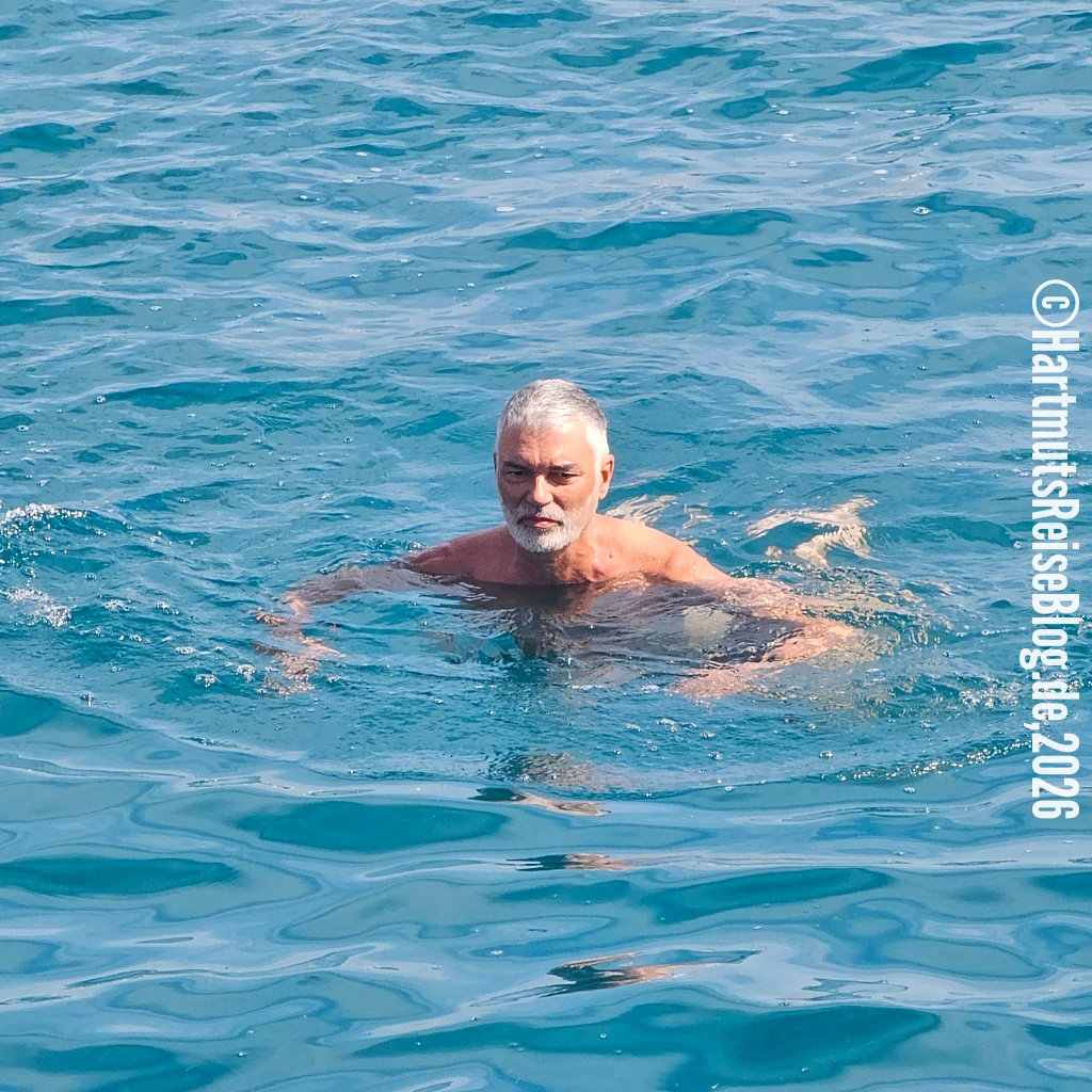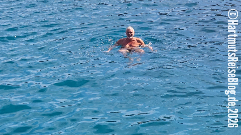 Andreas ist mutig und geht kurz ins kalte Wasser. Zum Abendessen sind wir wieder in Monte León.