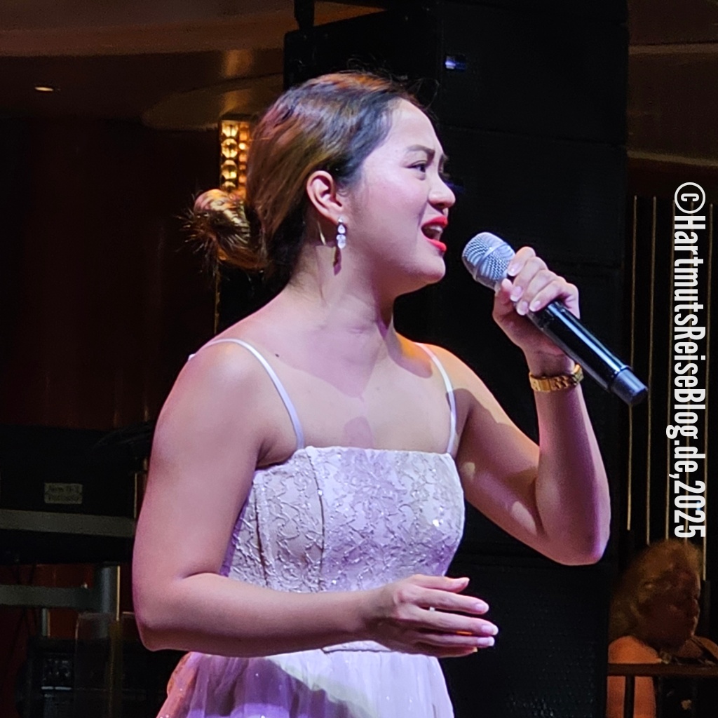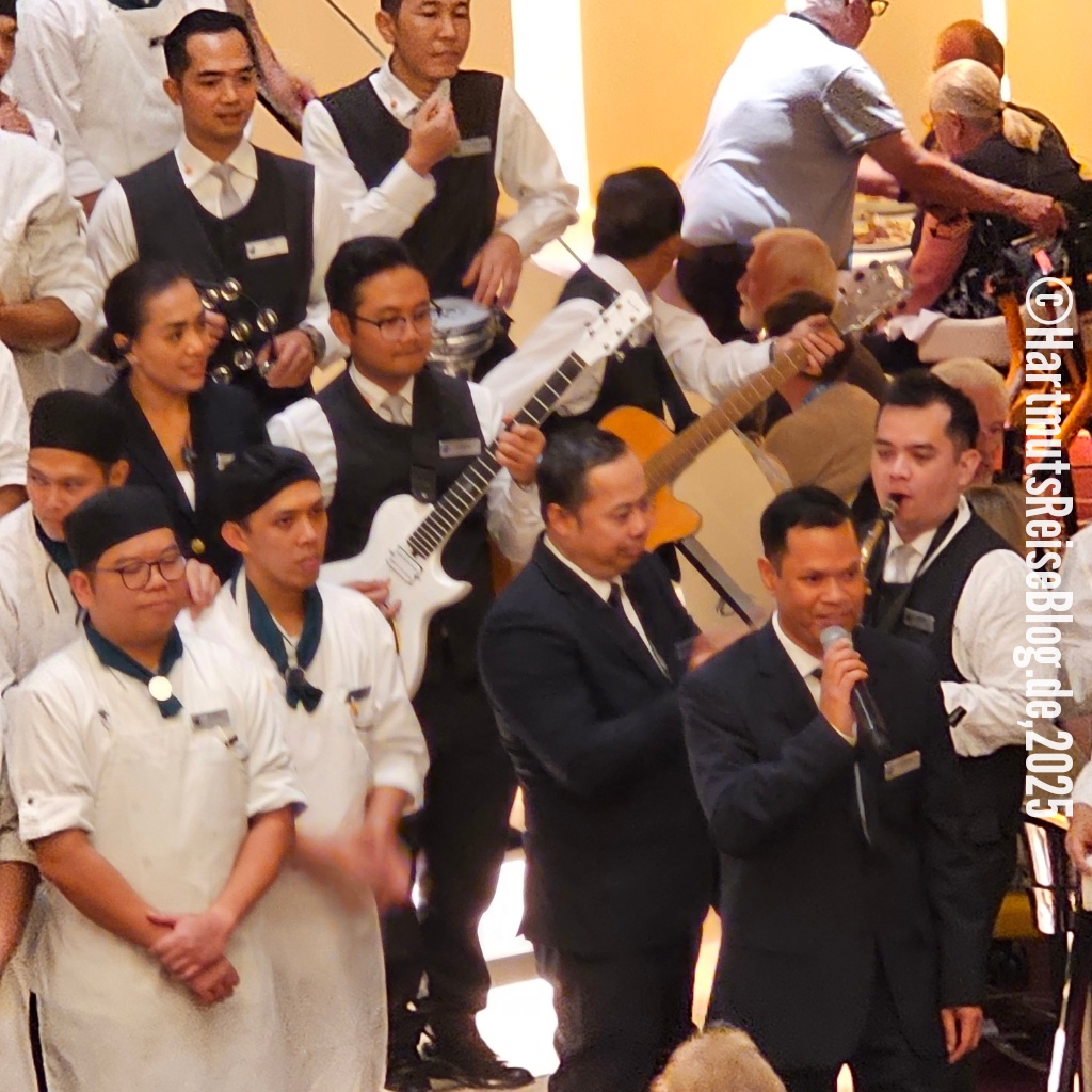 Am Nachmittag beginne ich mit dem Packen unserer Koffer. Zum – wie meist – sehr frühen Abendessen gehen wir ein letztes Mal in den Dining Room. Während wir die Nachspeise genießen, tragen die Kellner, Köche etc., die fast alle aus Indonesien kommen, ein Abschiedslied aus ihrer Heimat vor. Ein wirklich schöner Moment!