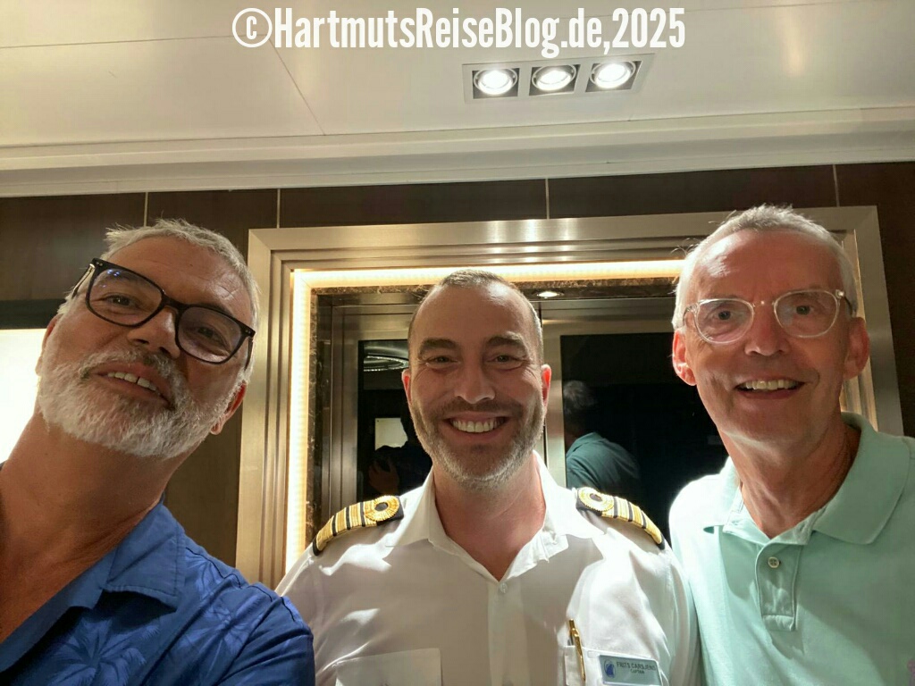 Auf dem Weg zur Kabine gibt es ein letztes “Aufzugsgespräch”. Der Kapitän höchstpersönlich, selbst ein großer Mann, spricht uns auf unsere Körperlänge an. Es ergibt sich ein nettes Gespräch und ein schnelles Selfie.