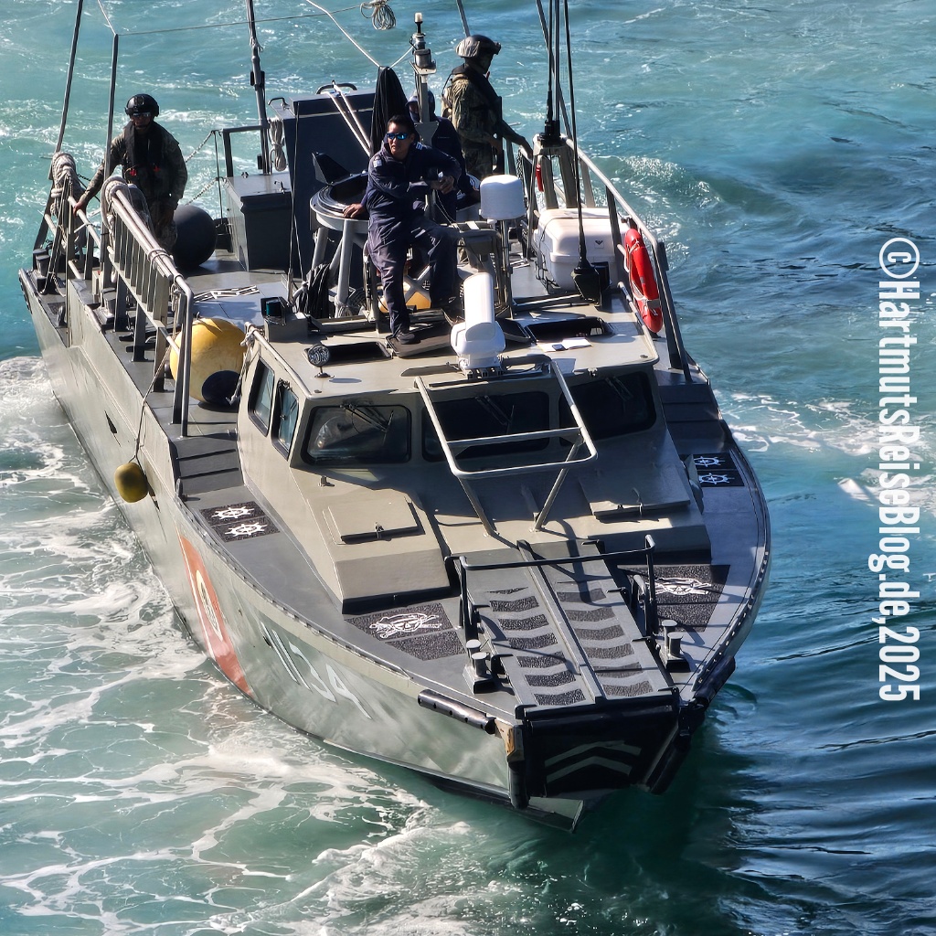 Beim Abendessen schwankt das Schiff merklich. Den Grund sehen wir beim Verdauungsspaziergang an der frischen Meeresluft: Der Pazifik ist ganz schön aufgewühlt. Wie wird die Nacht wohl werden?