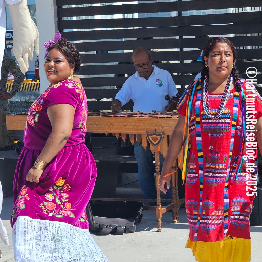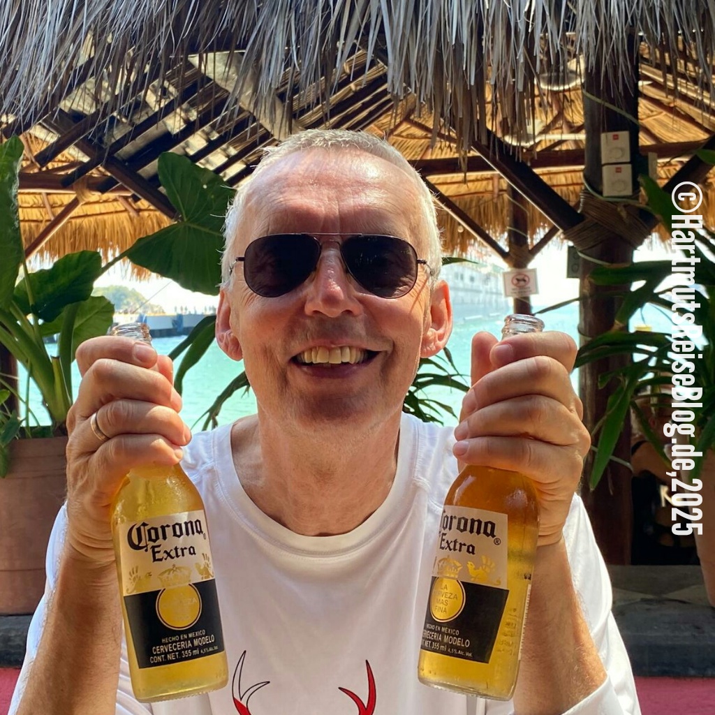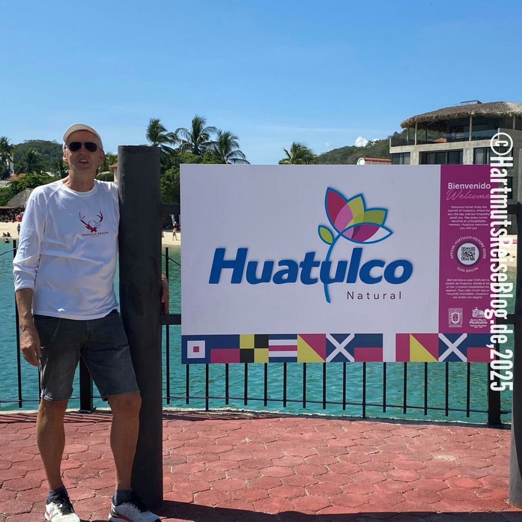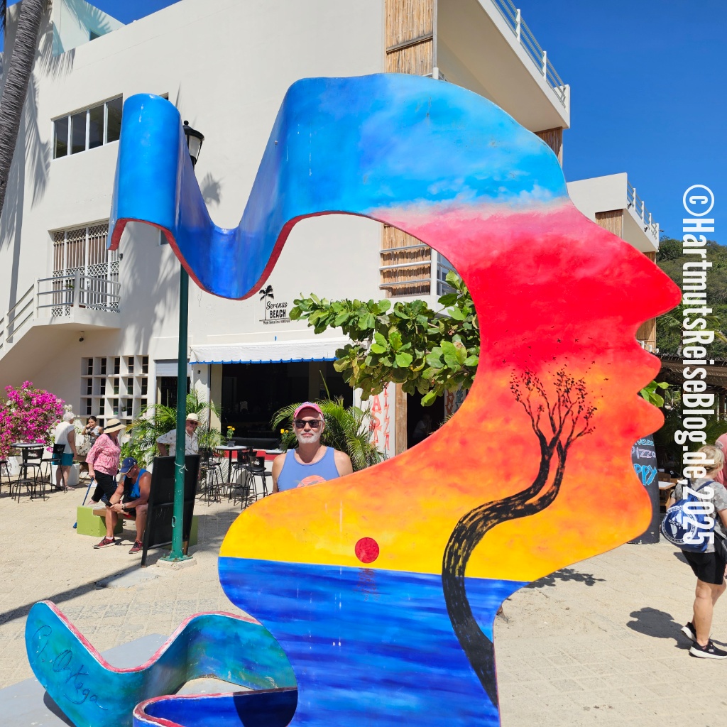Huatulco heißt der kleine Badeort an der Küste Oaxacas, den unser Schiff heute anläuft (Aussprache: wa’tul.co). Er besteht aus vielen Buchten mit sauberen Stränden. Santa Cruz ist die zentrale Bucht. Hier liegt der Kreuzfahrthafen sowie der Strand Playa Santa Cruz. In der Umgebung gibt es Boote für Ausflüge zu anderen Buchten, Geschäfte und kleine Restaurants. Wir erkunden die nähere Umgebung, kaufen zwei T-Shirts und trinken kühles Corona.