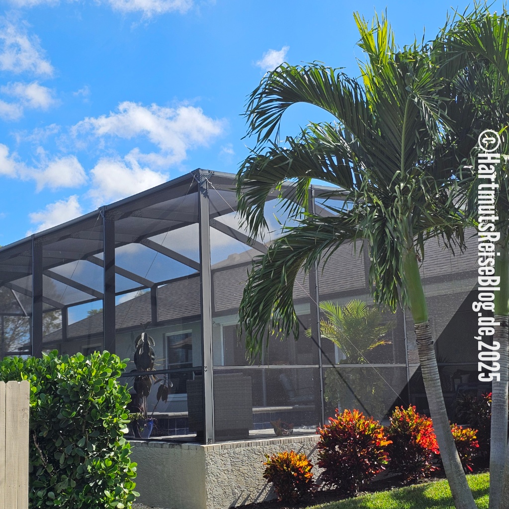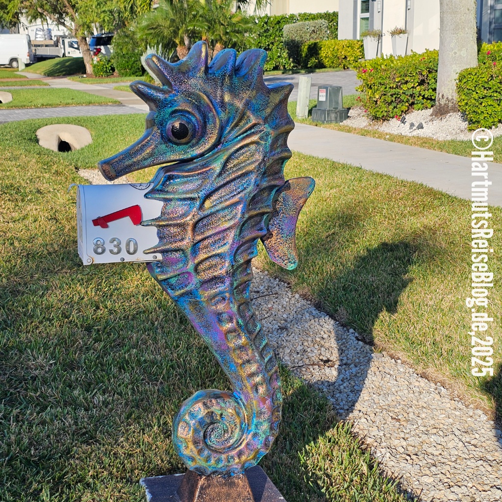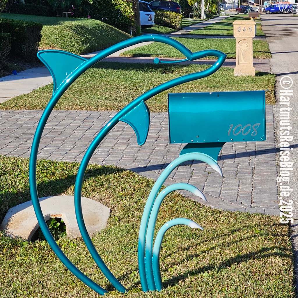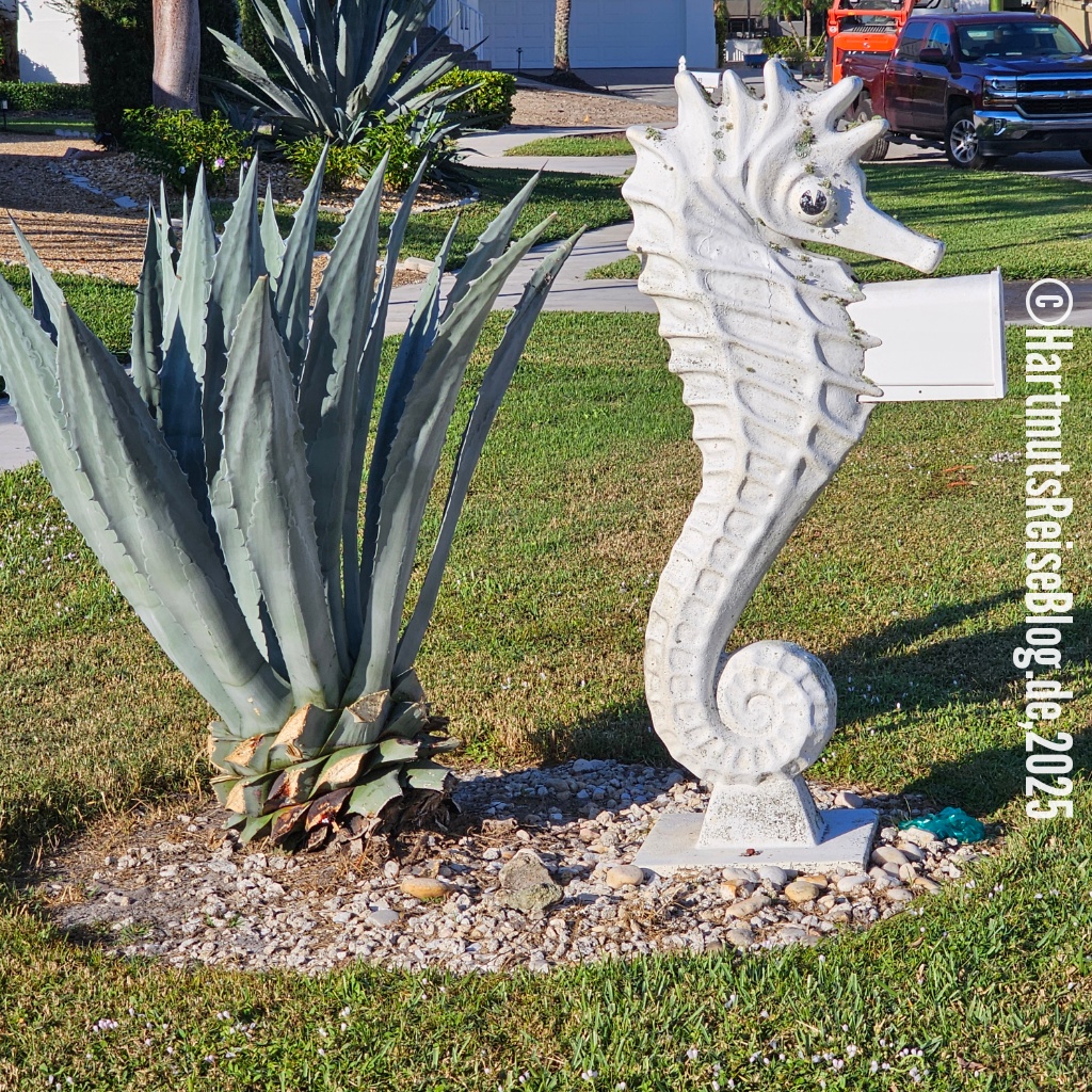 Der schöne Tag auf Marco Island beginnt mit einem Spaziergang durch die nähere Umgebung unserer Ferienwohnung. Mir fallen die vielen prächtigen Häuser auf. Fast alle haben hinter dem Gebäude eine Bootsanlegestelle und einen Pool. Über dem Pool befindet sich ein “Cage”, um nervige Insekten fernzuhalten. Auch der große Außenbereich unserer Wohnung ist durch ein sehr feinmaschiges Gitter geschützt. So können wir nachts die Außentüren geöffnet lassen. Die meisten Häuser haben zwei oder mehr Garagen. An der Straße stehen die Briefkästen, die häufig kreativ gestaltet sind. Beliebt sind Tiere wie Flamingos, Seepferdchen, Manatees und Delfine. Alligatoren scheinen nicht en vogue zu sein. Als Hobbygärtner interessiert mich natürlich auch die Bepflanzung. Viele schöne große Palmen, aber auch große Rasenflächen schmücken die Häuser. Es gibt nur wenige blühende Pflanzen. Nutzpflanzen wie Mangos, Papayas oder Citruspflanzen bekomme ich leider überhaupt nicht zu Gesicht.