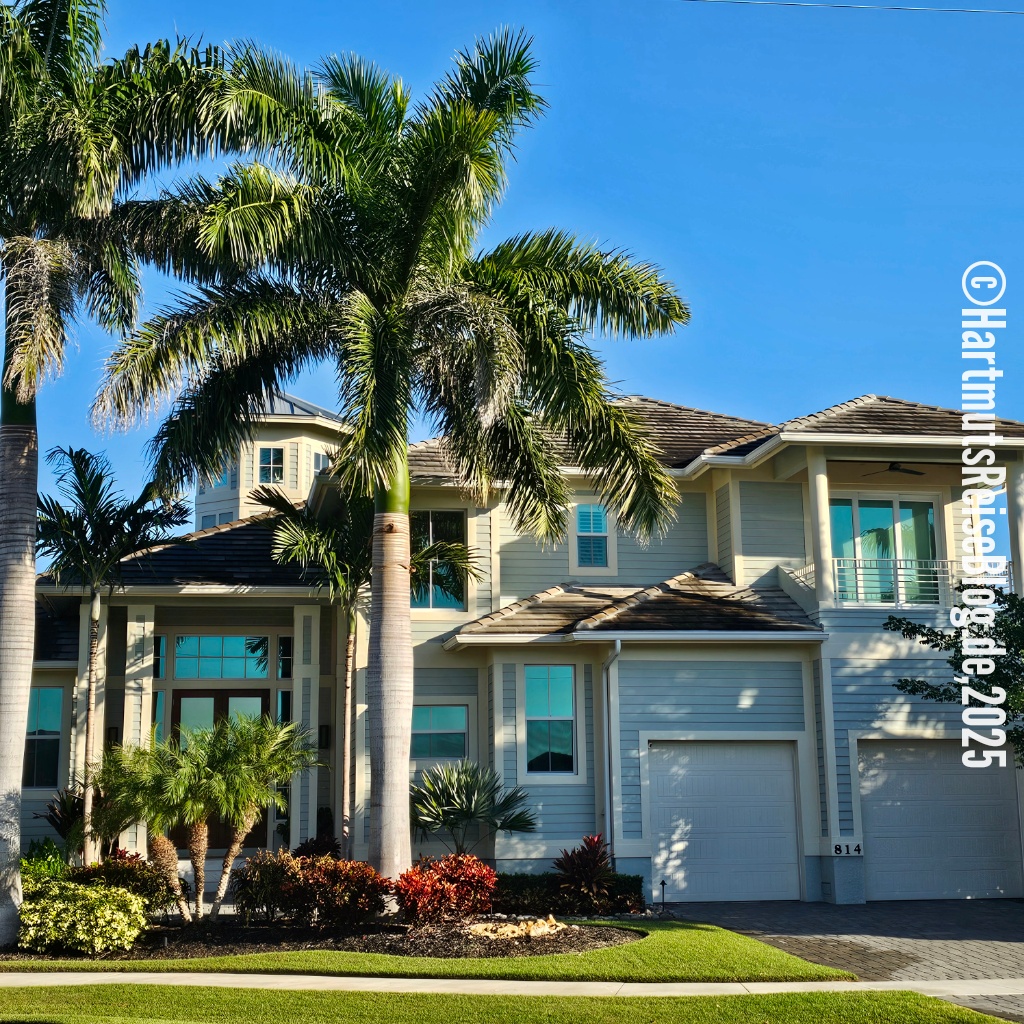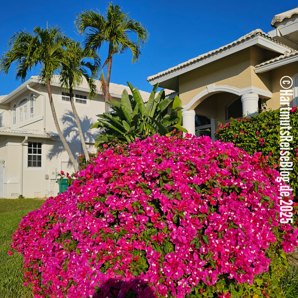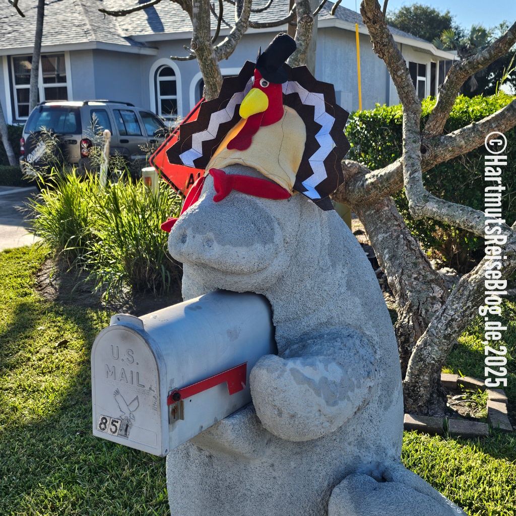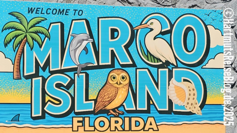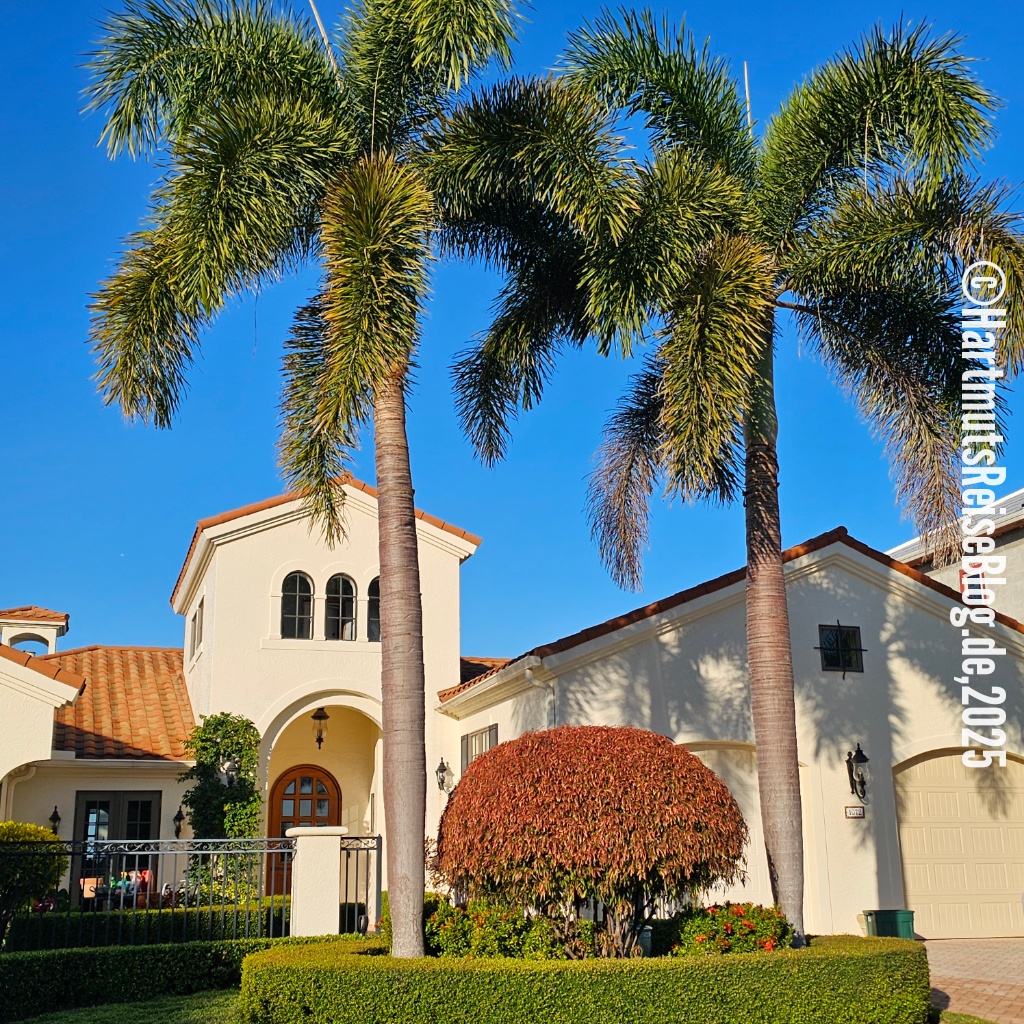 Der schöne Tag auf Marco Island beginnt mit einem Spaziergang durch die nähere Umgebung unserer Ferienwohnung. Mir fallen die vielen prächtigen Häuser auf. Fast alle haben hinter dem Gebäude eine Bootsanlegestelle und einen Pool. Über dem Pool befindet sich ein “Cage”, um nervige Insekten fernzuhalten. Auch der große Außenbereich unserer Wohnung ist durch ein sehr feinmaschiges Gitter geschützt. So können wir nachts die Außentüren geöffnet lassen. Die meisten Häuser haben zwei oder mehr Garagen. An der Straße stehen die Briefkästen, die häufig kreativ gestaltet sind. Beliebt sind Tiere wie Flamingos, Seepferdchen, Manatees und Delfine. Alligatoren scheinen nicht en vogue zu sein. Als Hobbygärtner interessiert mich natürlich auch die Bepflanzung. Viele schöne große Palmen, aber auch große Rasenflächen schmücken die Häuser. Es gibt nur wenige blühende Pflanzen. Nutzpflanzen wie Mangos, Papayas oder Citruspflanzen bekomme ich leider überhaupt nicht zu Gesicht.
