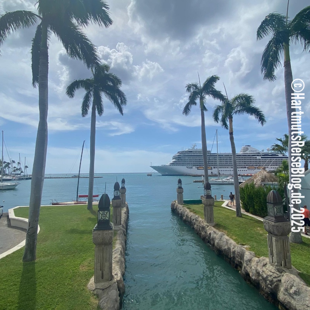Nach unserer morgendlichen Routine beobachten wir die Einfahrt unserer MS Koningsdam in den Hafen von Aruba.
