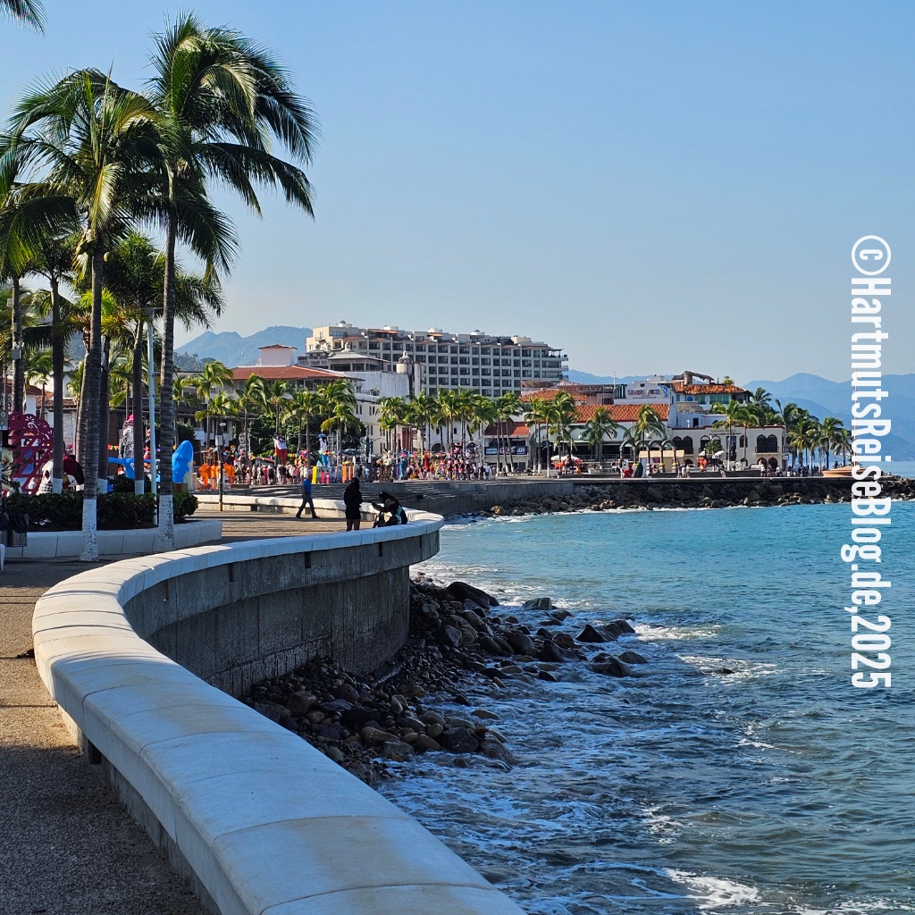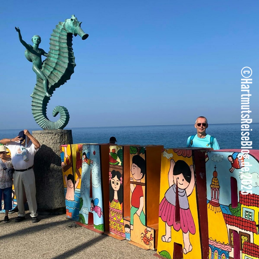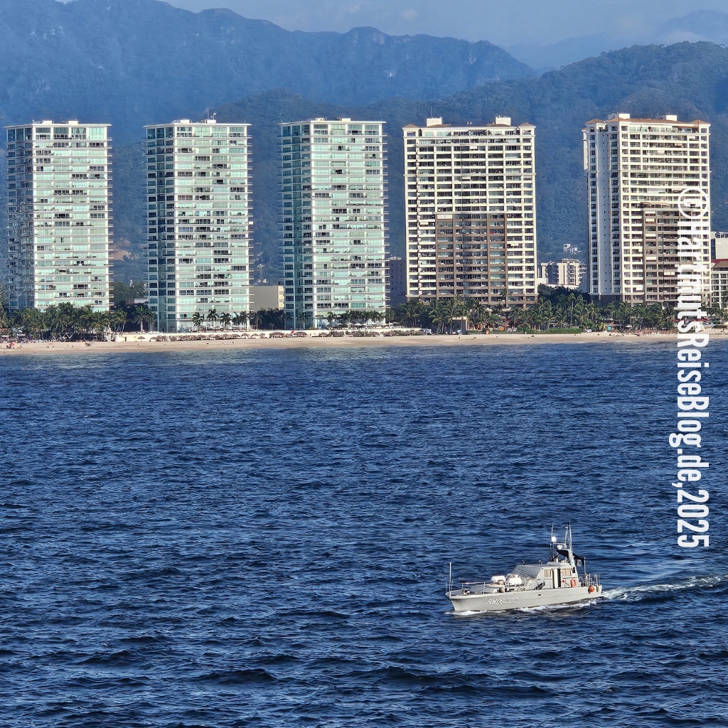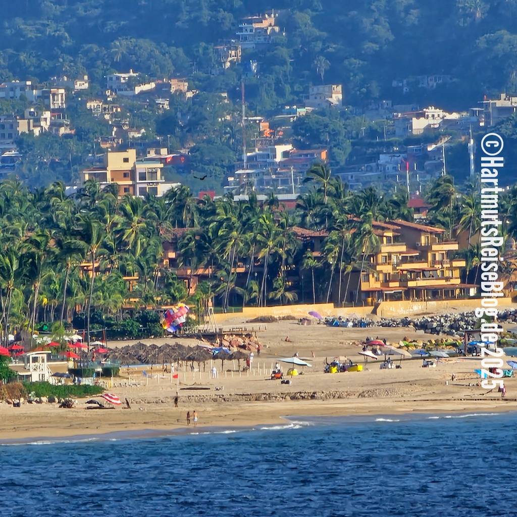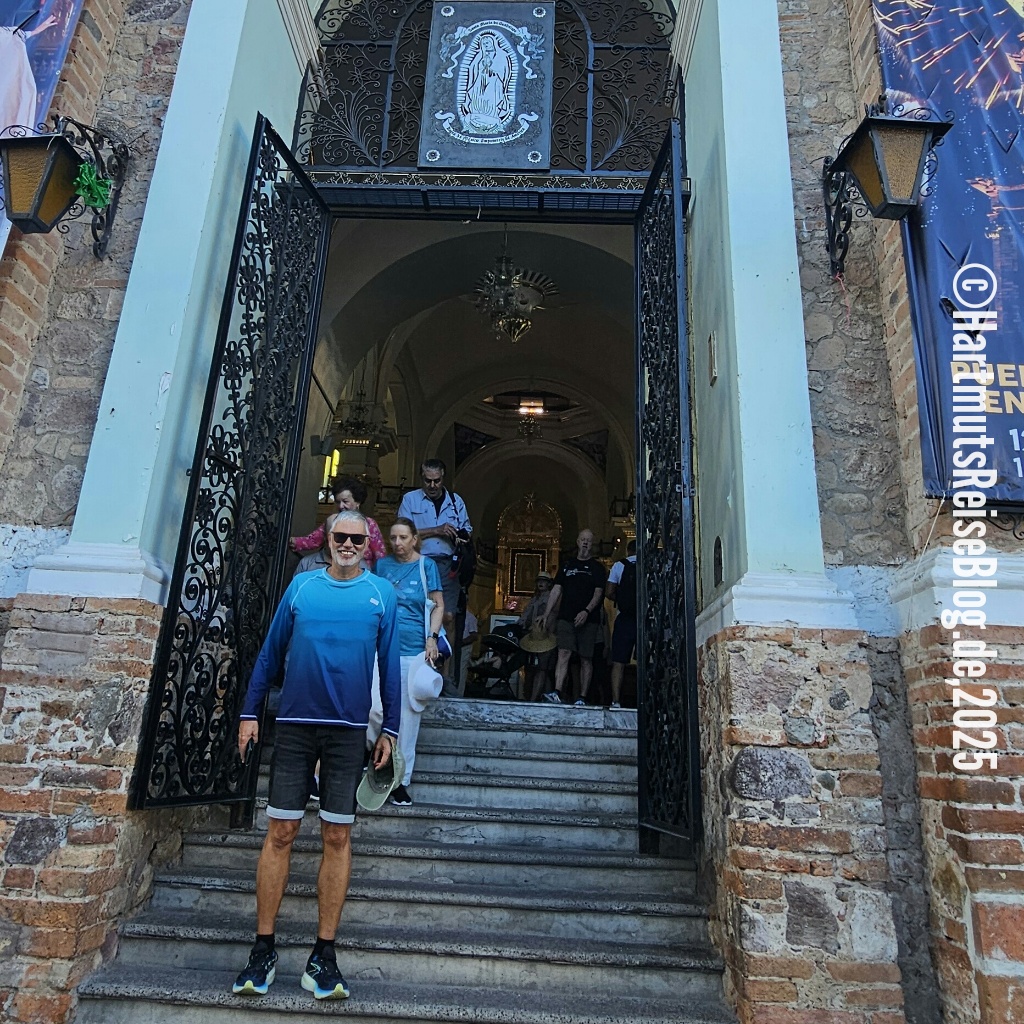Pünktlich kommt unser Schiff in Puerto Vallarta an. Gegen halb neun gehen wir von Bord. Zuerst bringt uns der Bus (mit Führer “crazy” Mario) zur Strandpromenade und zur Kathedrale im Zentrum von Puerto Vallarta. Viele Teilnehmer dieses Ausflugs sind sehr alt und gebrechlich. Nicht wenige sind auf Gehhilfen angewiesen. Die Straßen sind mit großen Steinen gepflastert. Damit sind Geschwindigkeitsbegrenzungen völlig überflüssig. Außerdem fallen mir die vielen Regenbogenflaggen auf. Wir wissen von Bekannten in San Diego, dass Puerto Vallarta ein beliebtes Reiseziel für Schwule ist. Es sollen übrigens 40.000 Amerikaner dauerhaft in dieser rasant wachsenden Stadt leben. Hinzu kommen die vielen Besucher aus Nordamerika und Europa (vor allem Niederländer und Briten).
