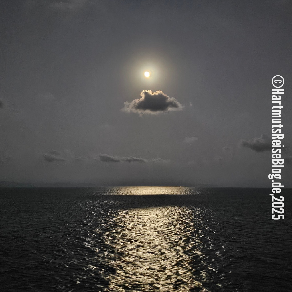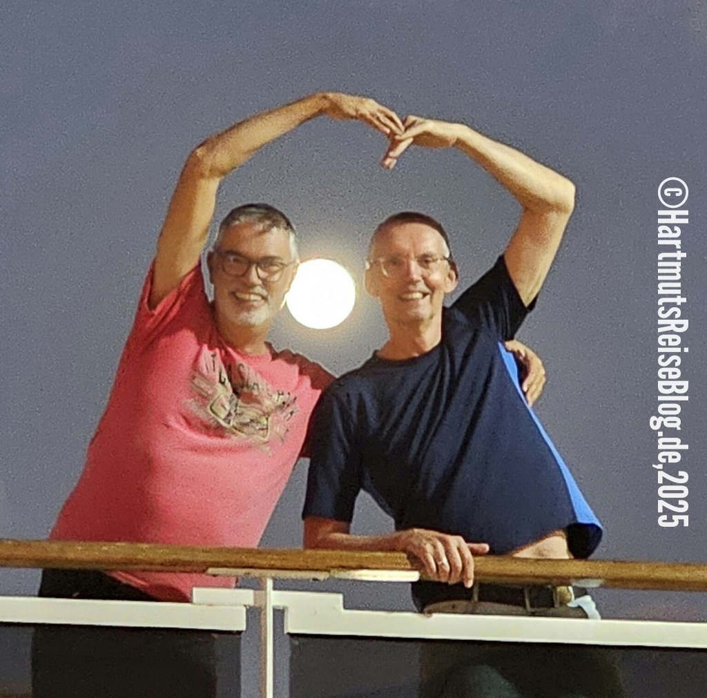 Abends genießen wir den Blick auf den (fast) Vollmond. Andreas geht ein Deck höher, damit ich ihn dort neben dem Mond fotografieren kann. Ein Stewart schlägt dann vor, dass ich mich zu Andreas stelle, damit wir beide den Mond einrahmen. Das lässt anderen Gästen keine Ruhe: Sie geben uns von unten Hinweise, wie wir uns oben noch hinstellen könnten. Es ergeben sich witzige Momente und auch sehr schöne Fotos, die uns daran erinnern werden.