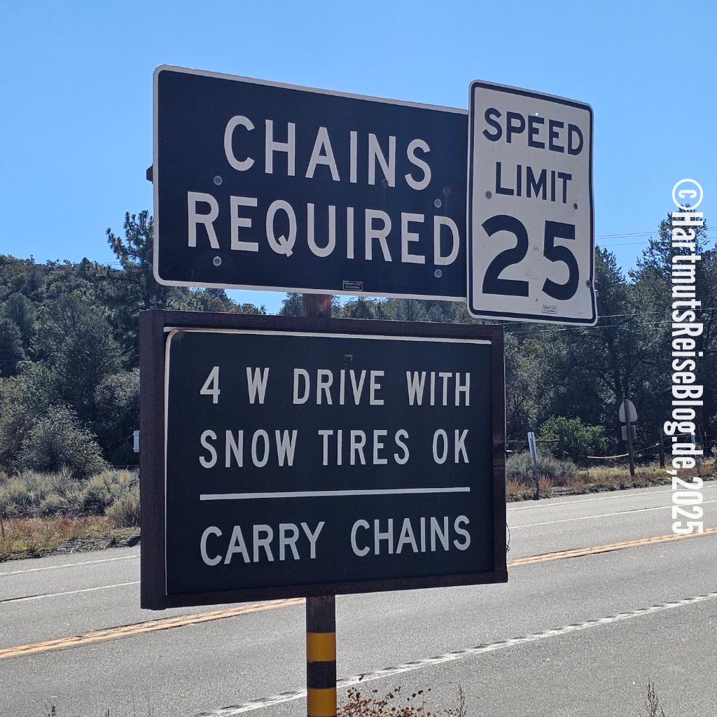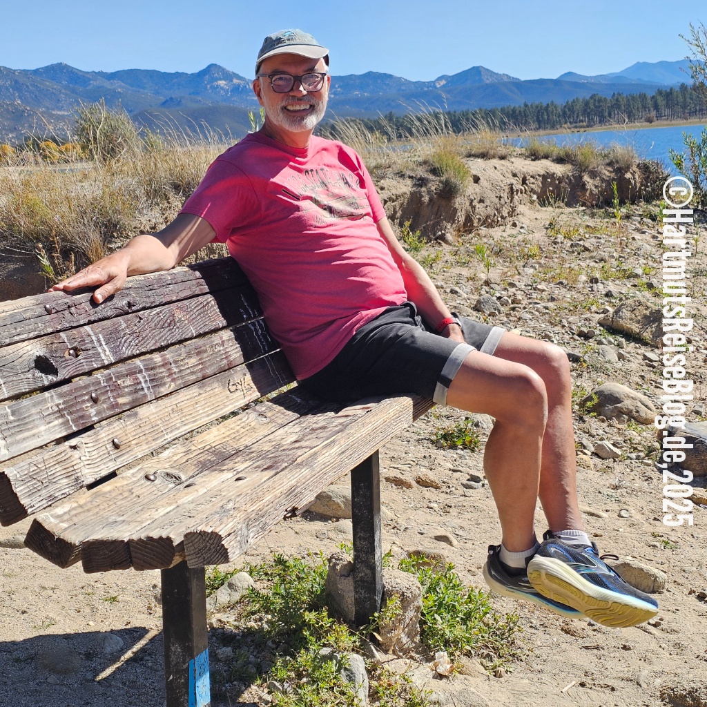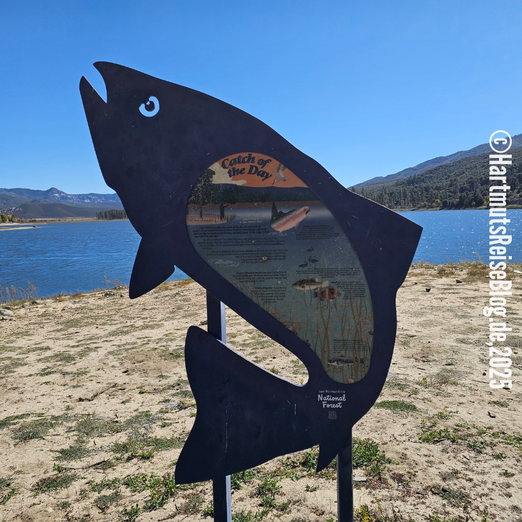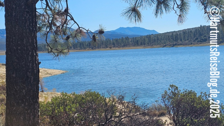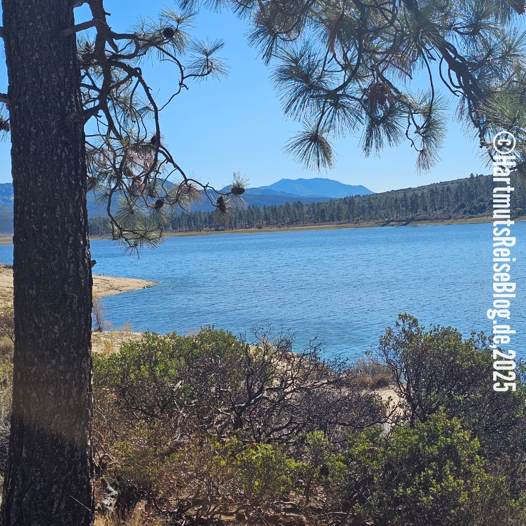 Das nächste Ziel heute ist Lake Hemet, ein Stausee nordwestlich von Paradise Valley im San Bernardino National Forest. Hier oben fühlen wir uns weit weg von der südkalifornischen Wüste. Menschen sehen wir kaum. Leider endet der Versuch, den See zu umwandern an einem Zaun mit Verbotsschild.