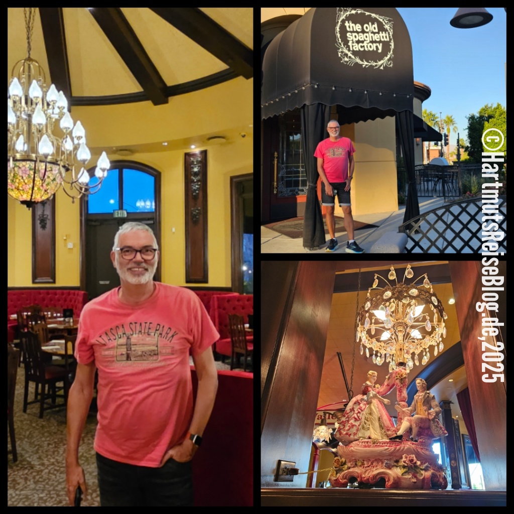 Abends fahren wir zur Old Spaghetti Factory in Rancho Mirage. Ein Restaurant dieser Kette war unser Favorit auf Hawaii. Das Essen ist lecker. Ausstattung und Atmosphäre sind kaum zu toppen. Zurück im Oasis Resort genehmigen wir uns noch ein Glas Rotwein.