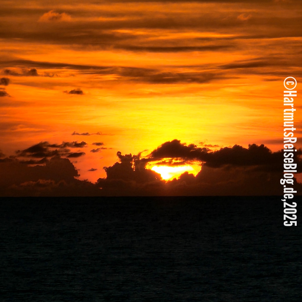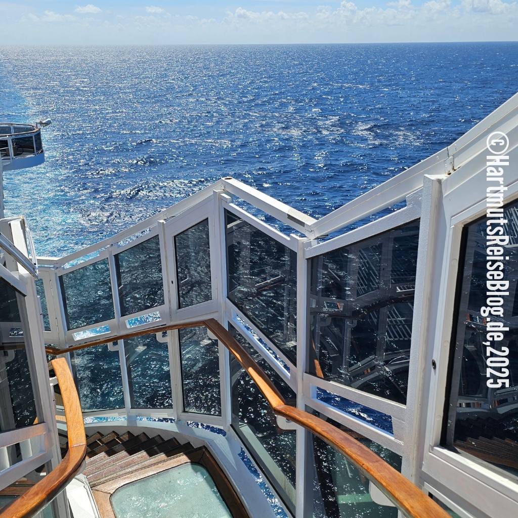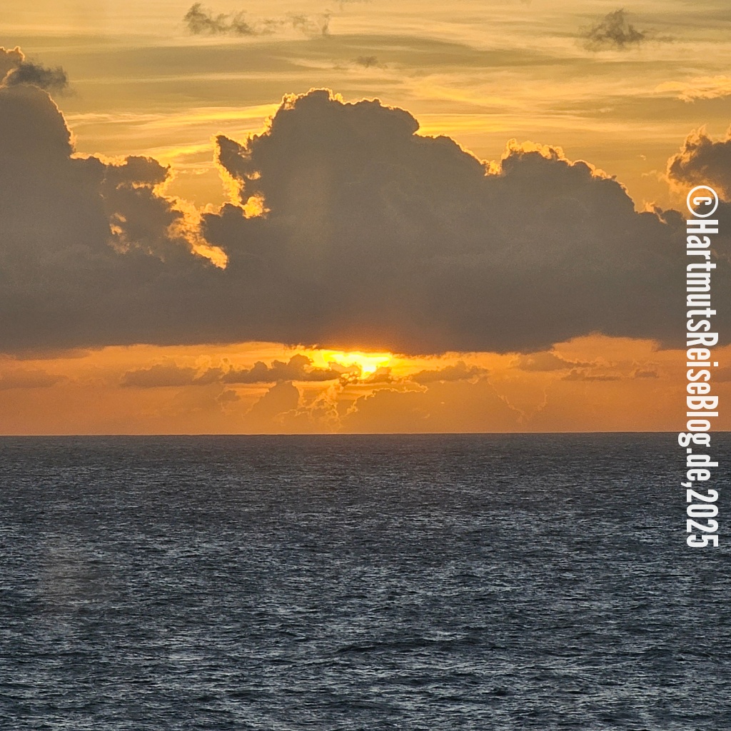 Als wir um zwölf Uhr unser erstes Bier trinken (0,0% von Heineken), ergreift Kapitän “Frits” wieder das Wort. Er teilt uns u. a. mit, dass das nächstgelegene Land 280 Kilometer entfernt ist – und zwar die Südspitze der Dominikanischen Republik. Übermorgen früh werden wir in den Bahamas ankommen.