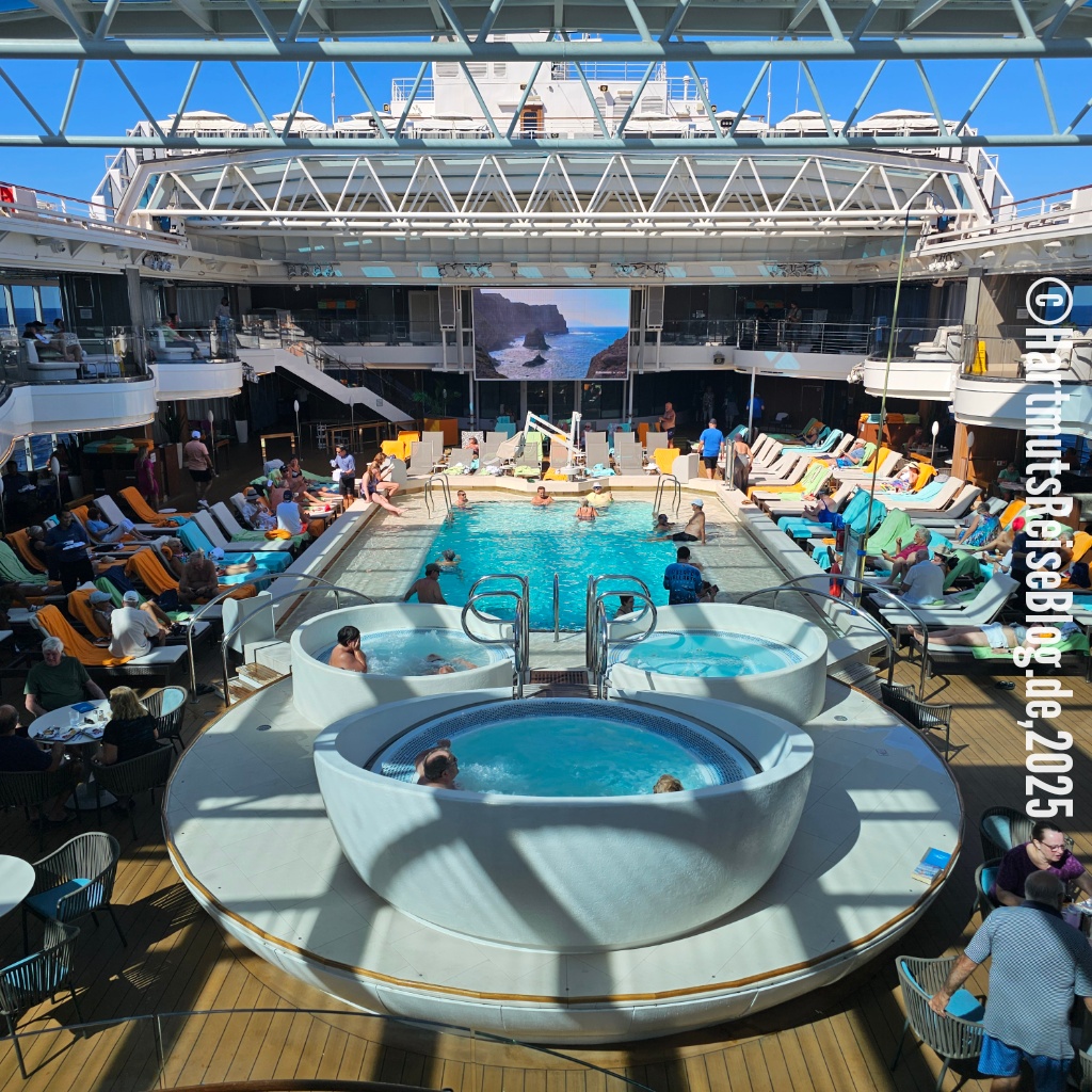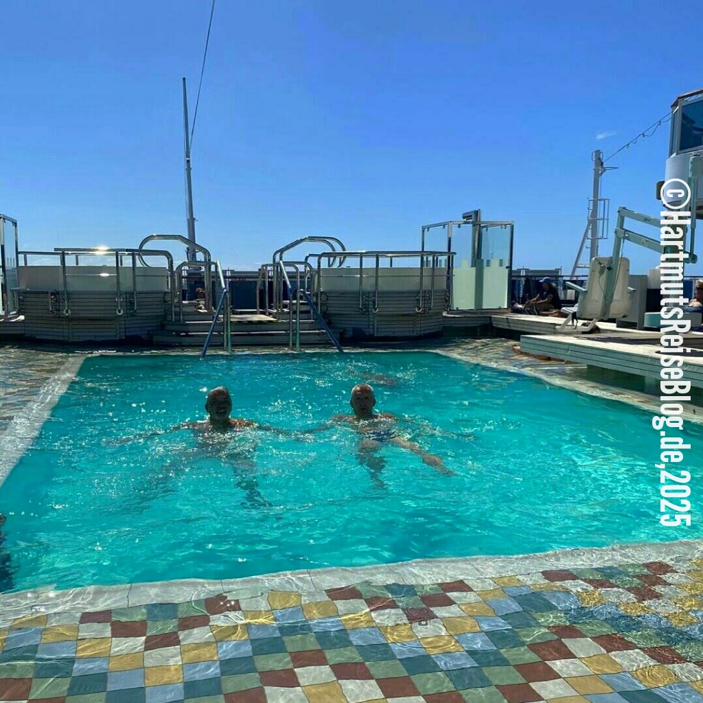 Der letzte Seetag an Bord der MS Koningsdam wird durch die Mahlzeiten bestimmt: Breakfast und Tea Time im Dining Room und spätes Abendessen im Spezialitätenrestaurant Canaletto. Schön sind immer die zufälligen Begegnungen im Restaurant, am Pool, im Aufzug etc. Ich habe eine kleine Sammlung von typischen “Aufzugsfragen” erstellt: How tall are you? Do you play basketball? Are you Dutch? Are you brothers? Are you related? Und ganz neu: Are you twins?