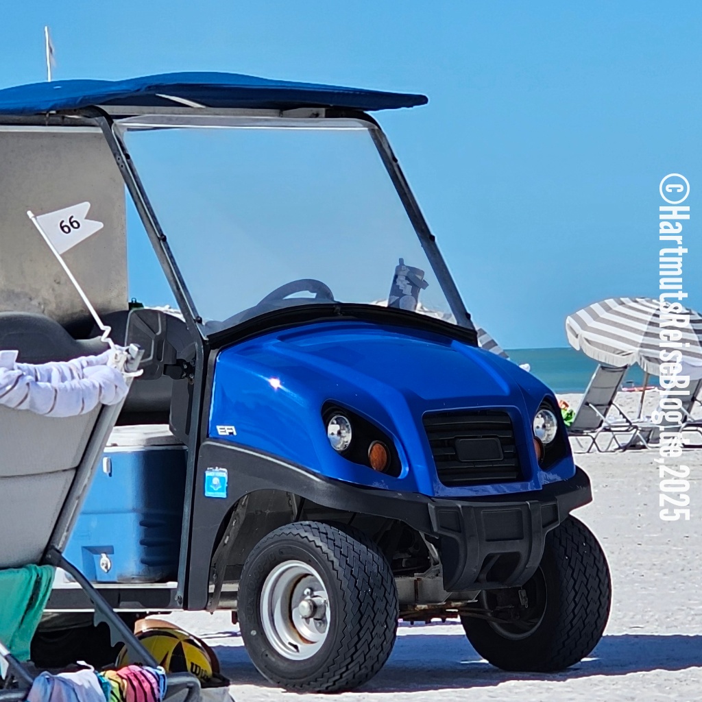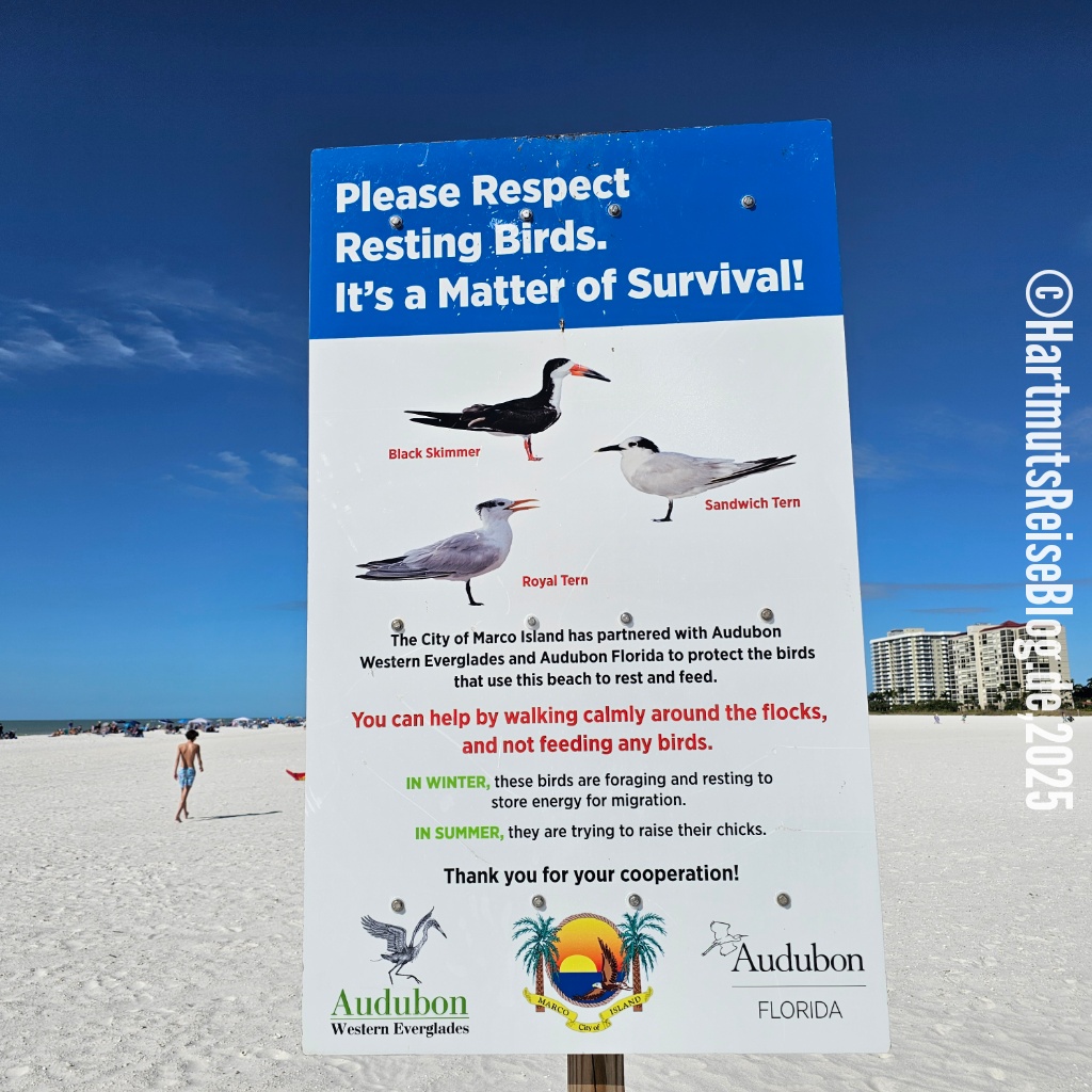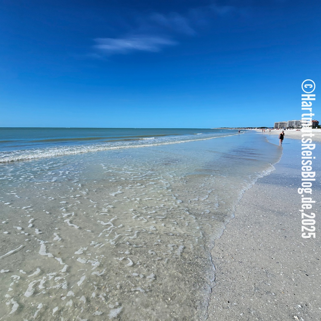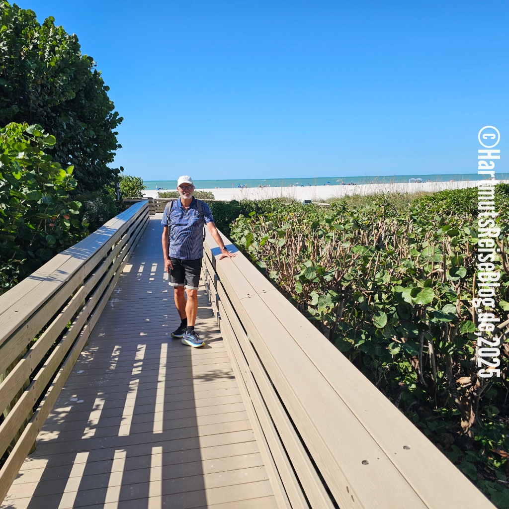 Auch heute Morgen ist es ziemlich kalt an der amerikanischen Golfküste. Nach dem Einkauf bei Publix und dem Frühstück auf unserer Terrasse fahren wir ins Zentrum der Insel, parken dort unser Auto und gehen zum South Beach. Zu Beginn unserer großen Reise haben wir überlegt, ob wir – wie auf Hawaii – eine amerikanische SIM-Karte kaufen sollen. Wir haben uns dagegen entschieden, da wir sie auf Hawaii nur selten benötigt hatten. Leider hat diese Entscheidung einen Nachteil: Wir können nur selten auf öffentlichen Parkplätze unser Auto abstellen. Denn um die Parkgebühr zu zahlen, muss man mit dem Smartphone einen am Parkplatz angebrachten QR-Code scannen und dann im Internet zahlen. Da wir also kein mobiles Internet haben, parken wir abseits des Strandes und gehen einen längeren Weg. Bei den heutigen Temperaturen ist das kein Problem.