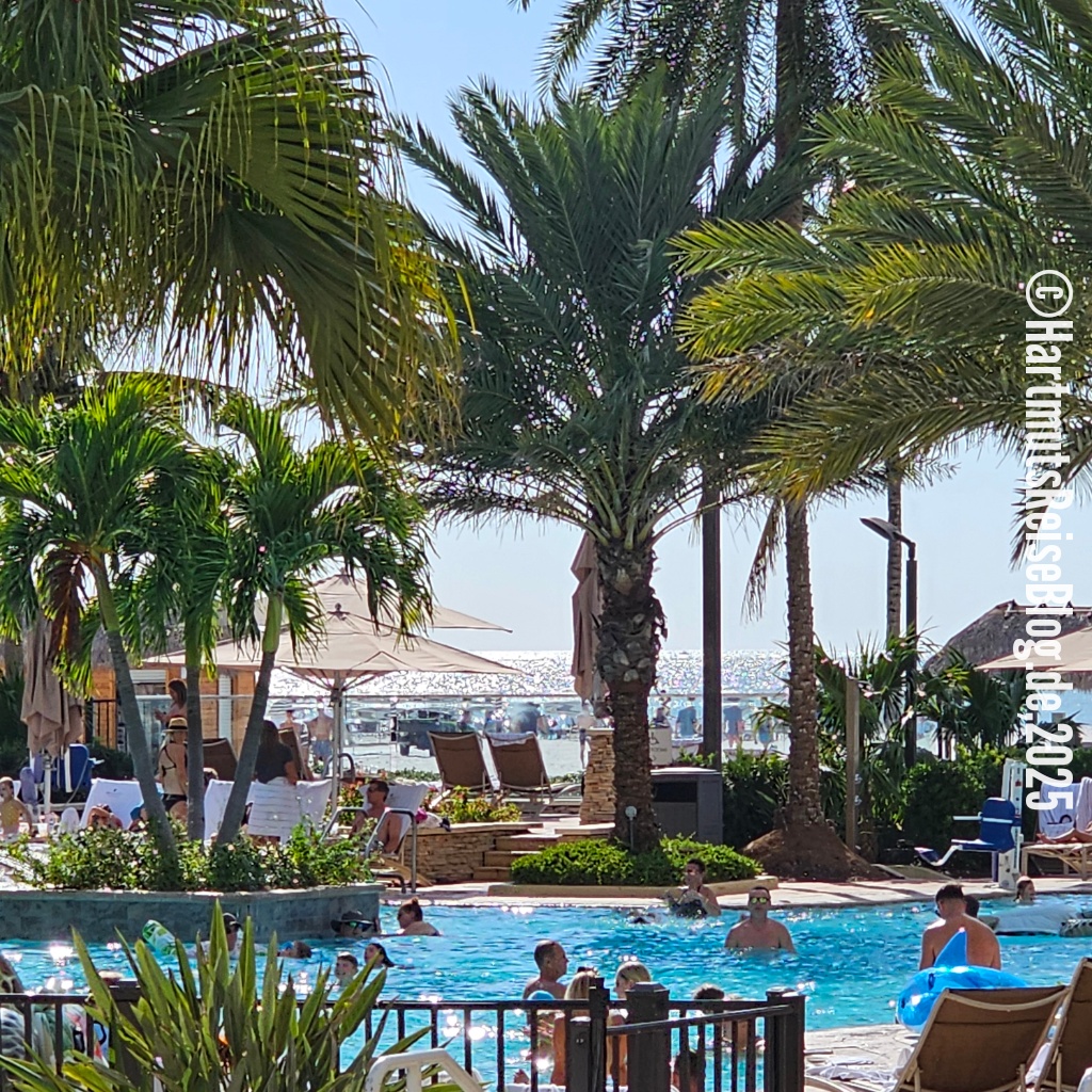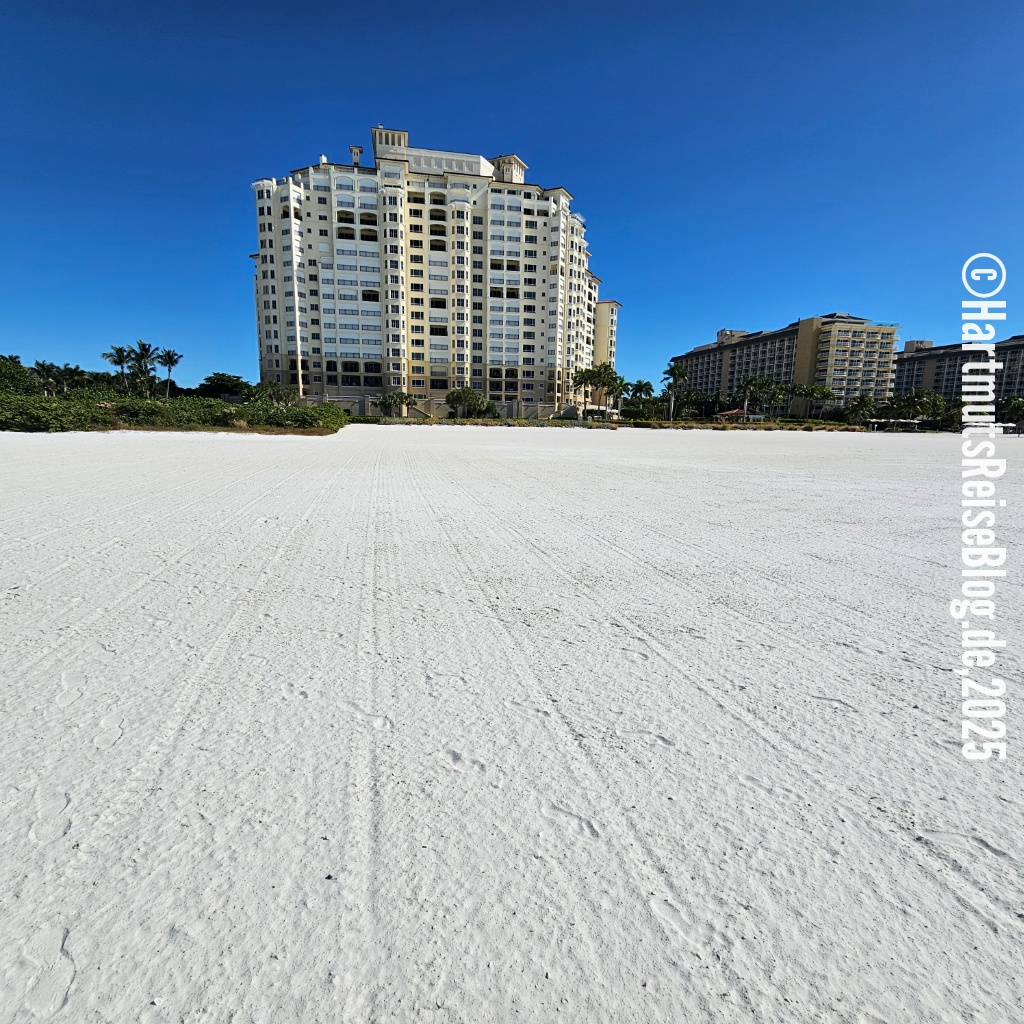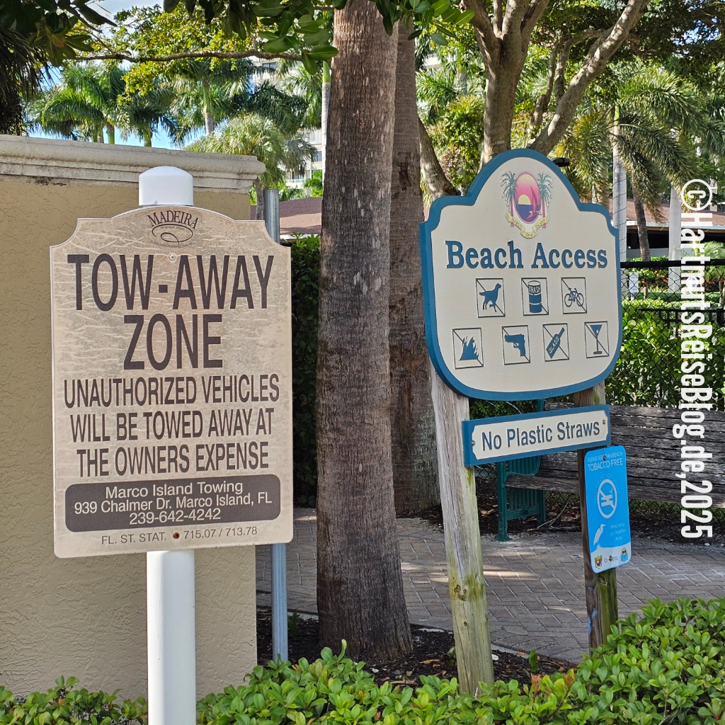 Ein weiteres Problem ist häufig der schwer zu findende Zugang zum Strand. Fast überall steht “No beach access”. Die Strände sind öffentlich, aber man muss erstmal dorthin kommen. Unser Strandzugang ist schmal, aber der Strand ist riesig. Für 50 Dollar bekommen wir zwei Liegen, einen Sonnenschirm und zwei Handtücher. Außerdem gibt es einen Essens- und Getränkeservice: Man bestellt, bekommt eine gut sichtbare Nummer und einige Zeit später wird die Bestellung an die Liege ausgeliefert. Der Service ist mit motorisierten Fahrzeugen unterwegs, denn der Weg vom Hotel (JW Marriott) bis zu den Liegen ist erheblich. Typisch Amerika: super Service!