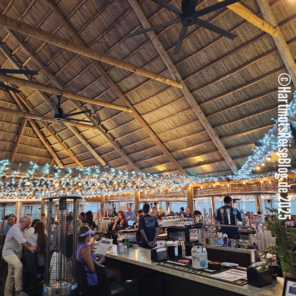 Abends essen wir wieder im Snook Inn. Wir sitzen am Wasser, über uns fliegen Pelikane und allmählich geht die Sonne unter. Die Abende im Snook Inn werden wir nicht vergessen.