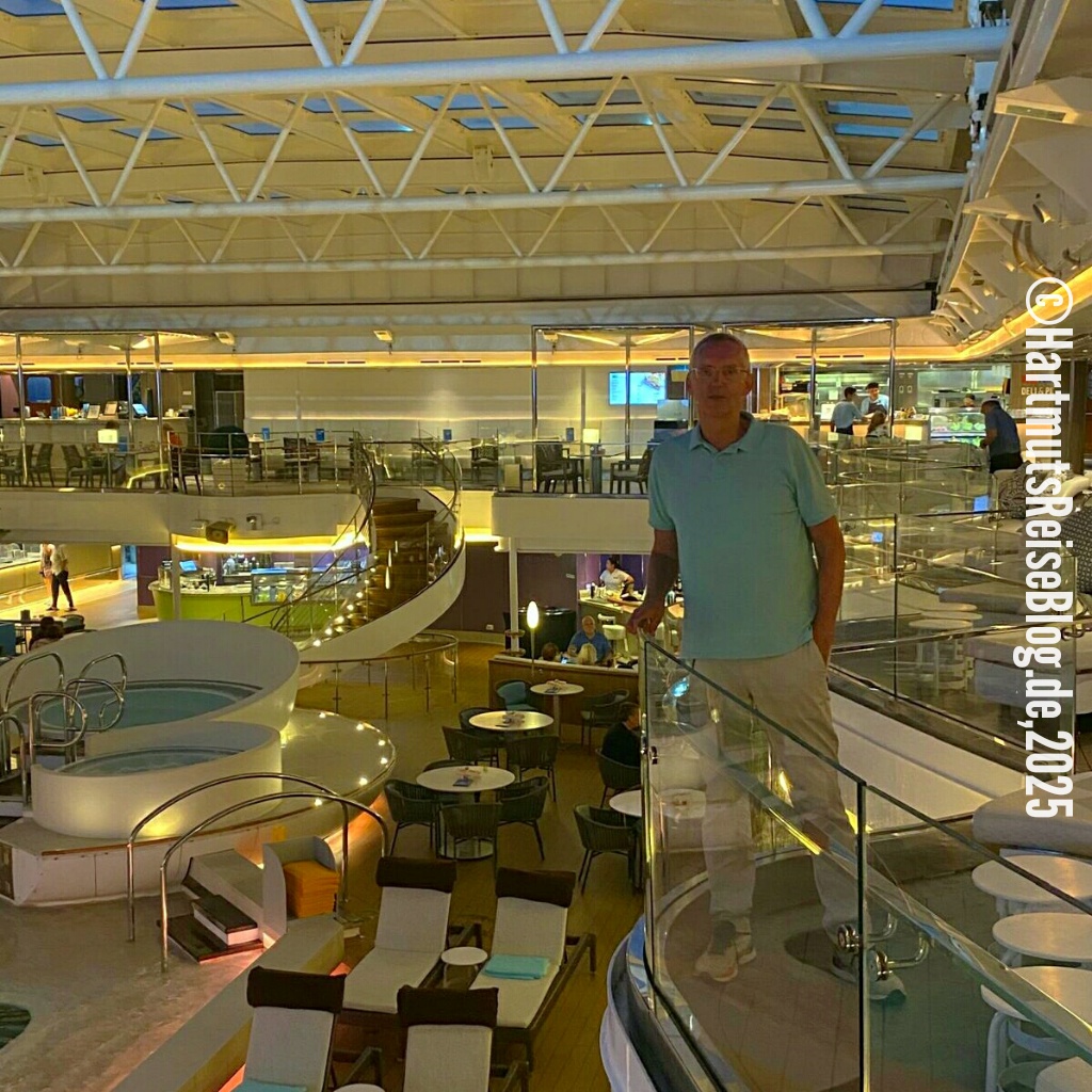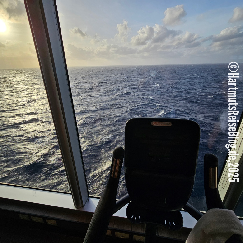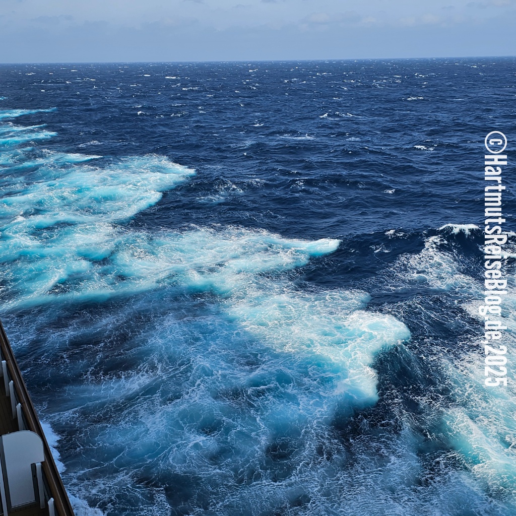 Um neun Uhr frühstücken wir im Lido Market, nachdem wir vorher im Gym waren. Eine ältere Dame sitzt am anderen Ende unseres langen Tisches. Sie erzählt uns ihre Lebensgeschichte: im Krieg in den Niederlanden geboren, mit vier auf einem HAL-Schiff nach Amerika ausgewandert und jetzt im kanadischen Calgary zuhause. Ich habe viele schwierige Fragen, möchte diese aber beim Frühstück nicht stellen. Sie ist total stolz darauf mit unserem Cruise Director befreundet zu sein.