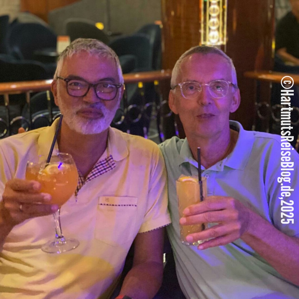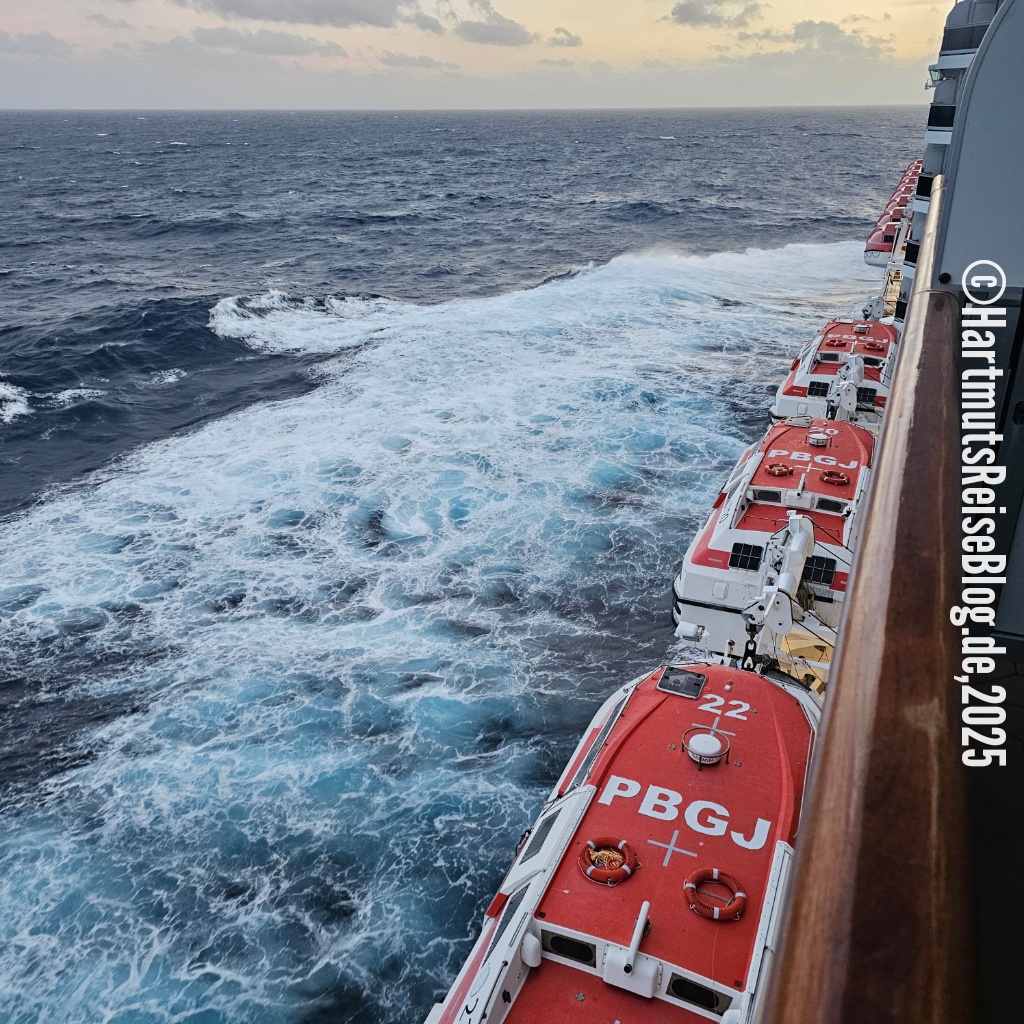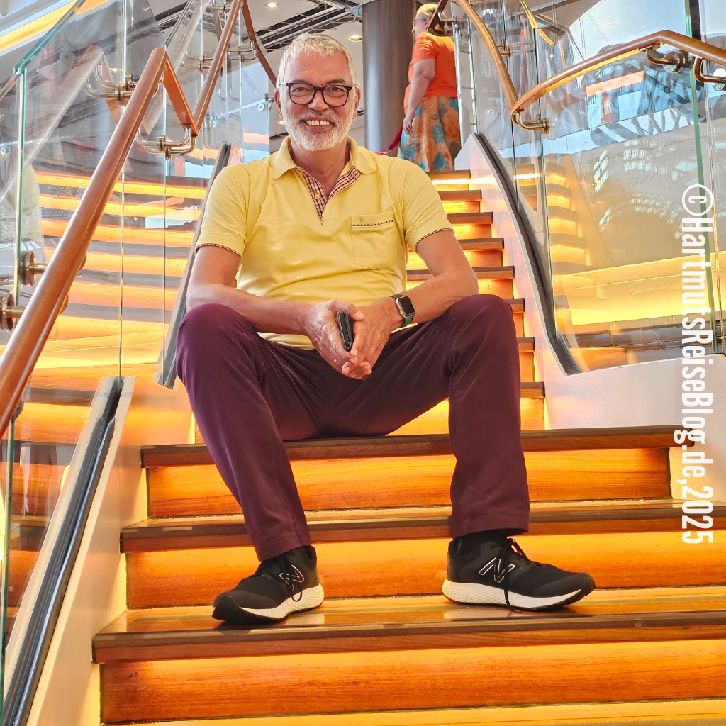 Um neun Uhr frühstücken wir im Lido Market, nachdem wir vorher im Gym waren. Eine ältere Dame sitzt am anderen Ende unseres langen Tisches. Sie erzählt uns ihre Lebensgeschichte: im Krieg in den Niederlanden geboren, mit vier auf einem HAL-Schiff nach Amerika ausgewandert und jetzt im kanadischen Calgary zuhause. Ich habe viele schwierige Fragen, möchte diese aber beim Frühstück nicht stellen. Sie ist total stolz darauf mit unserem Cruise Director befreundet zu sein.